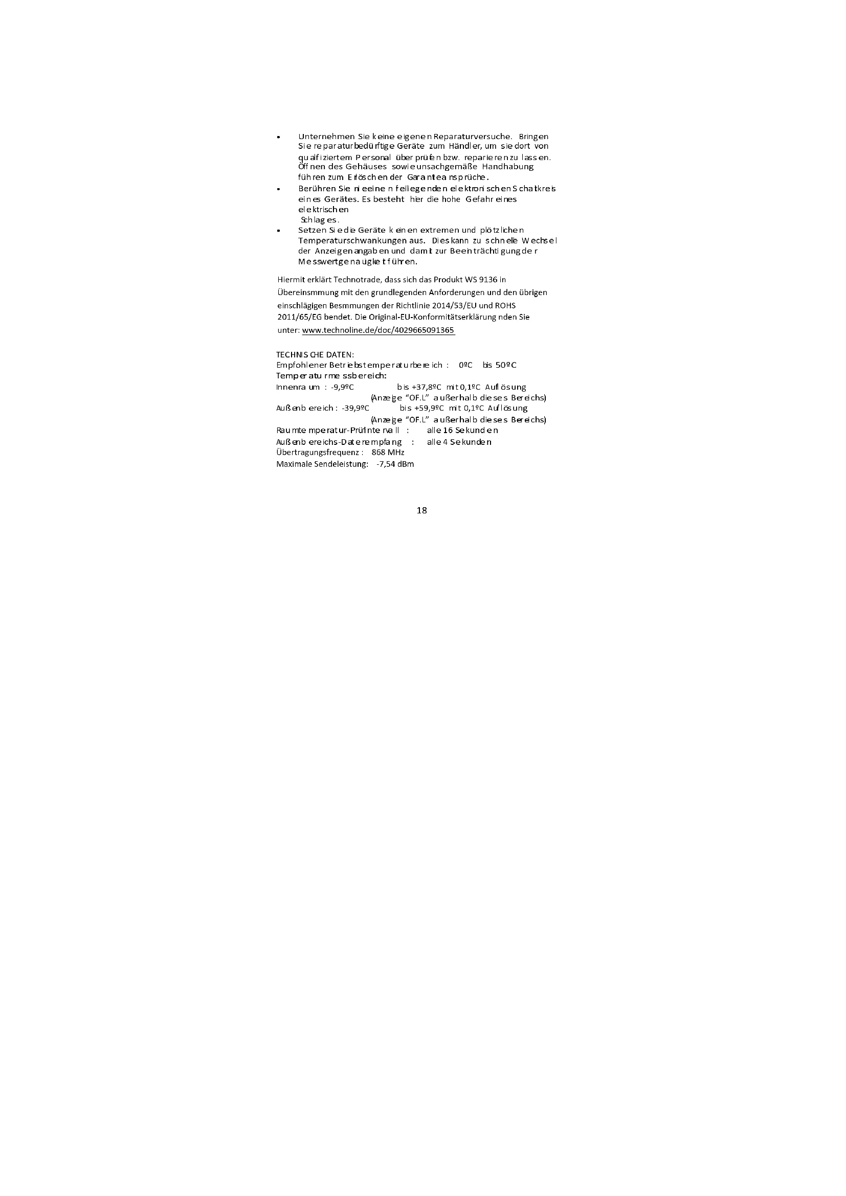 Hiermit erklärt Technotrade, dass sich das Produkt WS 9136 in Übereinstimmung mit den grundlegenden Anforderungen und den übrigen einschlägigen Bestimmungen der Richtlinie 2014/53/EU und ROHS 2011/65/EG befindet. Die Original-EU-Konformitätserklärung finden Sie unter: www.technoline.de/doc/4029665091365