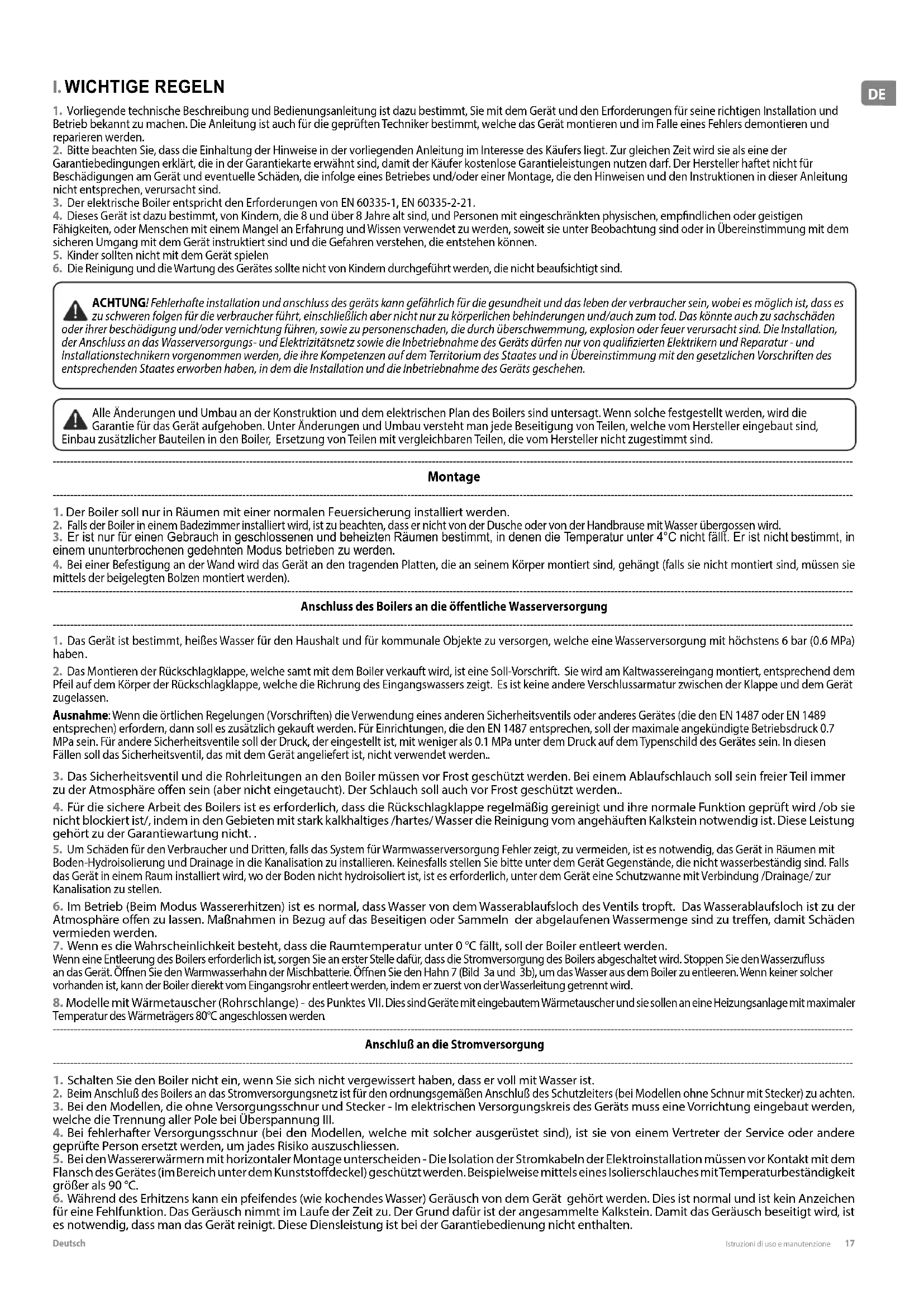 ACHTUNG! Fehlerhafte installation und anschluss des geräts kann gefährlich für die gesundheit und das leben der verbraucher sein, wobei es möglich ist, dass es zu schweren folgen für die verbraucher führt, einschließlich aber nicht nur zu körperlichen behinderungen und/auch zum tod. Das könnte auch zu sachschäden oder ihrer beschädigung und/oder vernichtung führen, sowie zu personenschaden, die durch überschwemmung, explosion oder feuer verursacht sind. Die Installation, der Anschluss an das Wasserversorgungs- und Elektrizitätsnetz sowie die Inbetriebnahme des Geräts dürfen nur von qualizierten Elektrikern und Reparatur - und Installationstechnikern vorgenommen werden, die ihre Kompetenzen auf dem Territorium des Staates und in Übereinstimmung mit den gesetzlichen Vorschriften des entsprechenden Staates erworben haben, in dem die Installation und die Inbetriebnahme des Geräts geschehen. Alle Änderungen und Umbau an der Konstruktion und dem elektrischen Plan des Boilers sind untersagt. Wenn solche festgestellt werden, wird die Garantie für das Gerät aufgehoben. Unter Änderungen und Umbau versteht man jede Beseitigung von Teilen, welche vom Hersteller eingebaut sind, Einbau zusätzlicher Bauteilen in den Boiler, Ersetzung von Teilen mit vergleichbaren Teilen, die vom Hersteller nicht zugestimmt sind.