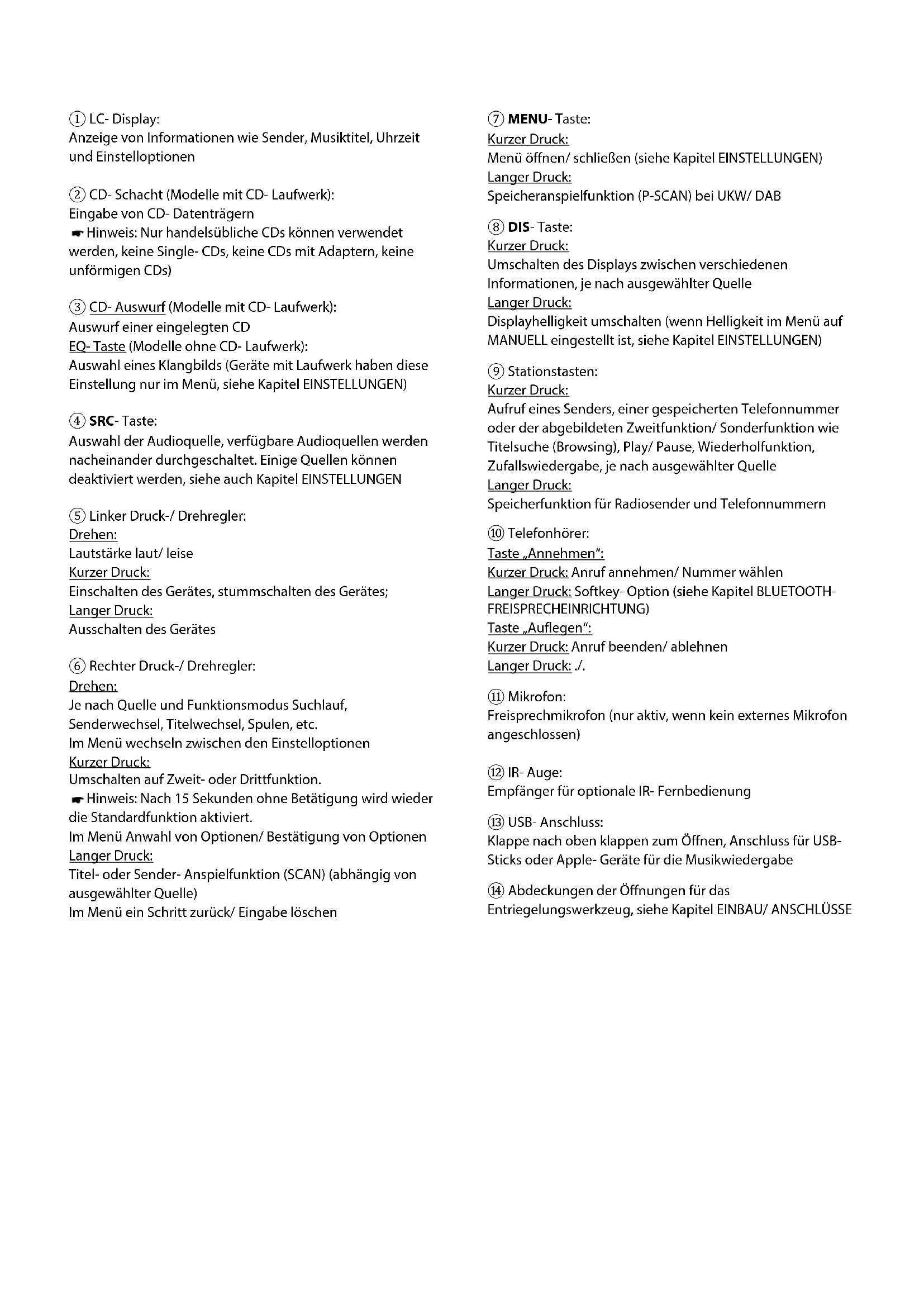 Bedienungsanleitung User Manual Brugsanvisning Bedieningshandleiding Käyttöohjeet Bruksanvisningar Mode d'emploi Instrucciones de uso Instruções de funcionamento Istruzioni per l'uso Instrukcja obsługi Használati utasítás Návod K Použití1. Bedienelemente- Gerät① LC- Display: Anzeige von Informationen wie Sender, Musiktitel, Uhrzeit und Einstelloptionen ② CD- Schacht (Modelle mit CD- Laufwerk): Eingabe von CD- Datenträgern Hinweis: Nur handelsübliche CDs können verwendet werden, keine Single- CDs, keine CDs mit Adaptern, keine unförmigen CDs) ③ CD- Auswurf (Modelle mit CD- Laufwerk): Auswurf einer eingelegten CD EQ- Taste (Modelle ohne CD- Laufwerk): Auswahl eines Klangbilds (Geräte mit Laufwerk haben diese Einstellung nur im Menü, siehe Kapitel EINSTELLUNGEN) ④ SRC- Taste: Auswahl der Audioquelle, verfügbare Audioquellen werden nacheinander durchgeschaltet. Einige Quellen können deaktiviert werden, siehe auch Kapitel EINSTELLUNGEN ⑤ Linker Druck-/ Drehregler: Drehen: Lautstärke laut/ leise Kurzer Druck: Einschalten des Gerätes, stummschalten des Gerätes; Langer Druck: Ausschalten des Gerätes ⑥ Rechter Druck-/ Drehregler: Drehen: Je nach Quelle und Funktionsmodus Suchlauf, Senderwechsel, Titelwechsel, Spulen, etc. Im Menü wechseln zwischen den Einstelloptionen Kurzer Druck: Umschalten auf Zweit- oder Drittfunktion. Hinweis: Nach 15 Sekunden ohne Betätigung wird wieder die Standardfunktion aktiviert. Im Menü Anwahl von Optionen/ Bestätigung von Optionen Langer Druck: Titel- oder Sender- Anspielfunktion (SCAN) (abhängig von ausgewählter Quelle) Im Menü ein Schritt zurück/ Eingabe löschen ⑦ MENU- Taste: Kurzer Druck: Menü öffnen/ schließen (siehe Kapitel EINSTELLUNGEN) Langer Druck: Speicheranspielfunktion (P-SCAN) bei UKW/ DAB ⑧ DIS- Taste: Kurzer Druck: Umschalten des Displays zwischen verschiedenen Informationen, je nach ausgewählter Quelle Langer Druck: Displayhelligkeit umschalten (wenn Helligkeit im Menü auf MANUELL eingestellt ist, siehe Kapitel EINSTELLUNGEN) ⑨ Stationstasten: Kurzer Druck: Aufruf eines Senders, einer gespeicherten Telefonnummer oder der abgebildeten Zweitfunktion/ Sonderfunktion wie Titelsuche (Browsing), Play/ Pause, Wiederholfunktion, Zufallswiedergabe, je nach ausgewählter Quelle Langer Druck: Speicherfunktion für Radiosender und Telefonnummern ⑩ Telefonhörer: Taste „Annehmen“: Kurzer Druck: Anruf annehmen/ Nummer wählen Langer Druck: Softkey- Option (siehe Kapitel BLUETOOTH- FREISPRECHEINRICHTUNG) Taste „Auflegen“: Kurzer Druck: Anruf beenden/ ablehnen Langer Druck: ./. ⑪ Mikrofon: Freisprechmikrofon (nur aktiv, wenn kein externes Mikrofon angeschlossen) ⑫ IR- Auge: Empfänger für optionale IR- Fernbedienung ⑬ USB- Anschluss: Klappe nach oben klappen zum Öffnen, Anschluss für USB- Sticks oder Apple- Geräte für die Musikwiedergabe ⑭ Abdeckungen der Öffnungen für das Entriegelungswerkzeug, siehe Kapitel EINBAU/ ANSCHLÜSSEDE