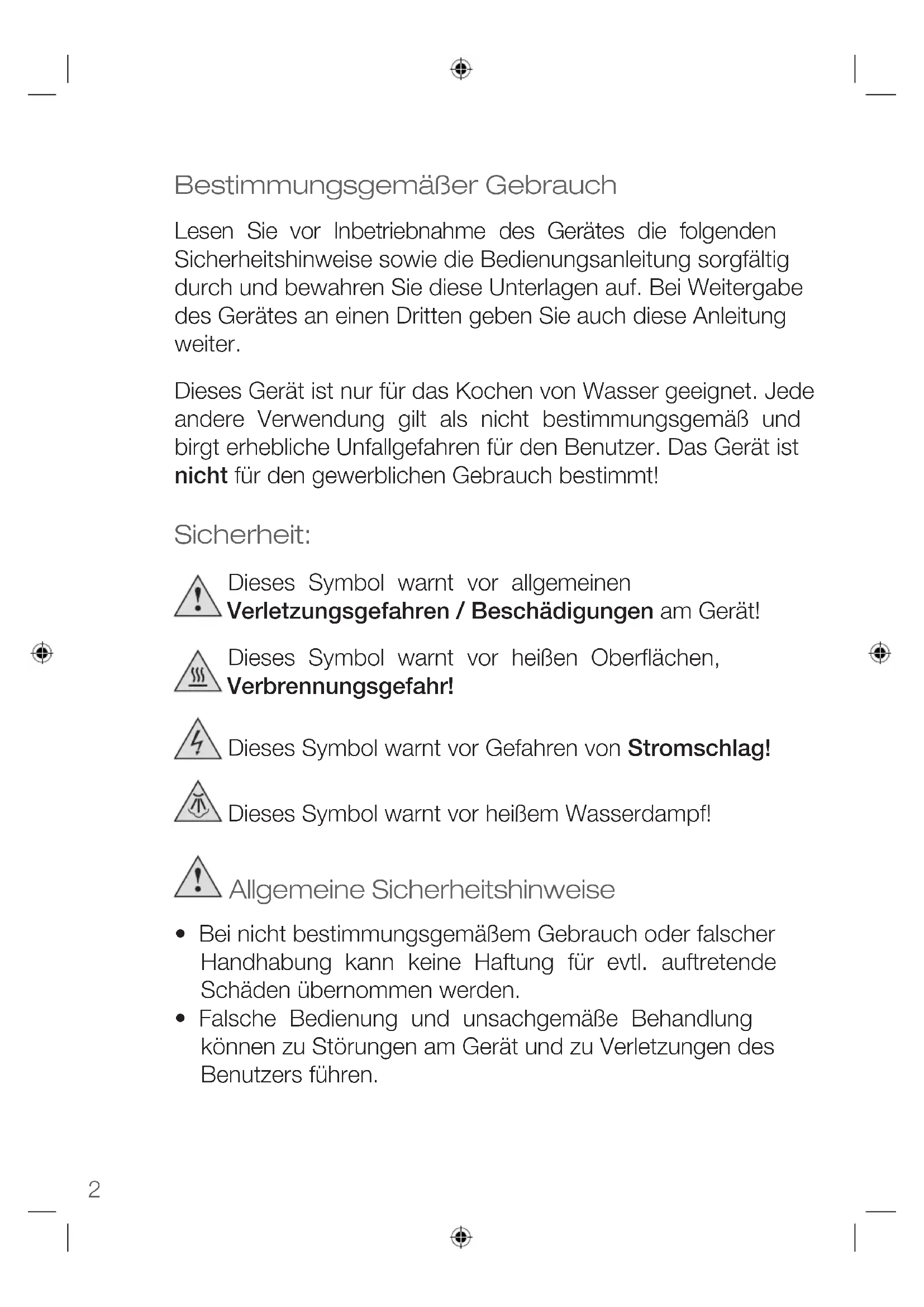 Bestimmungsgemäßer Gebrauch Lesen Sie vor Inbetriebnahme des Gerätes die folgenden Sicherheitshinweise sowie die Bedienungsanleitung sorgfältig durch und bewahren Sie diese Unterlagen auf. Bei Weitergabe des Gerätes an einen Dritten geben Sie auch diese Anleitung weiter. Dieses Gerät ist nur für das Kochen von Wasser geeignet. Jede andere Verwendung gilt als nicht bestimmungsgemäß und birgt erhebliche Unfallgefahren für den Benutzer. Das Gerät ist nicht für den gewerblichen Gebrauch bestimmt! Sicherheit: Dieses Symbol warnt vor allgemeinen Verletzungsgefahren / Beschädigungen am Gerät! Dieses Symbol warnt vor heißen Oberflächen, Verbrennungsgefahr! Dieses Symbol warnt vor Gefahren von Stromschlag! Dieses Symbol warnt vor heißem Wasserdampf! Allgemeine Sicherheitshinweise