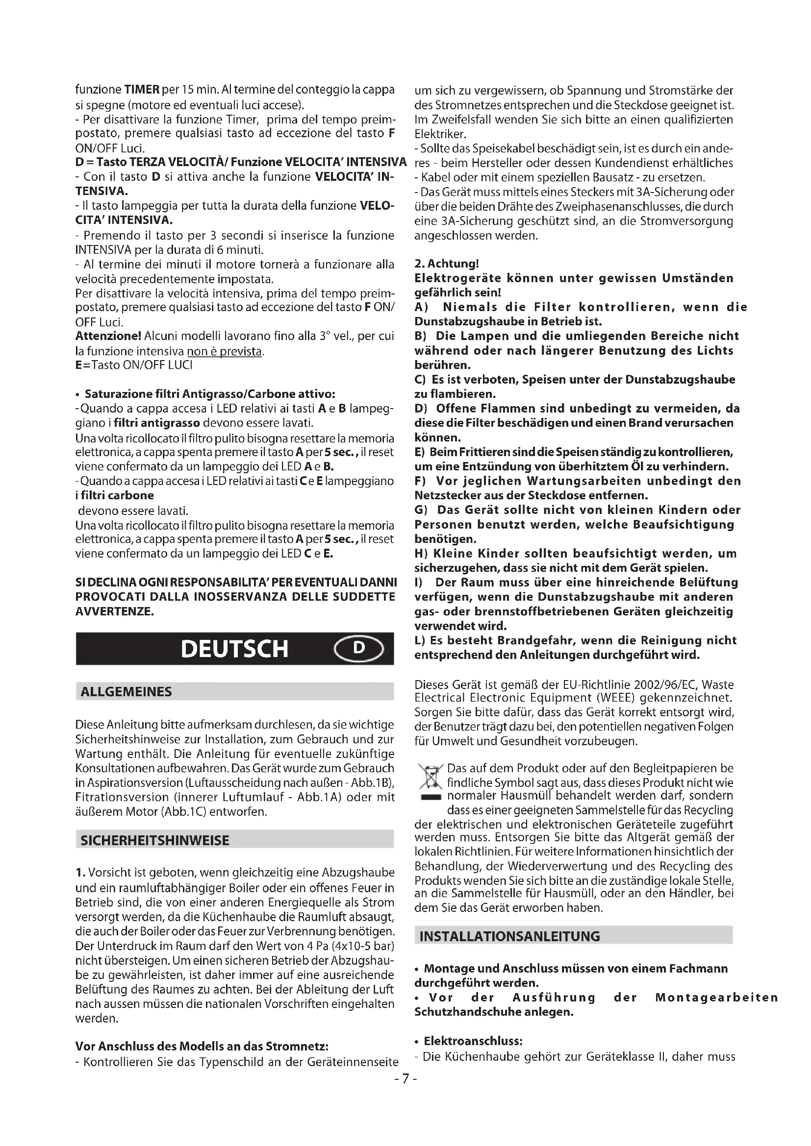 - SättigungderAntifett-undAktivkohlefilter: - Wenn bei eingeschalteter Abzugshaube die zu den Tasten A und B gehörenden LEDs blinken, müssen die Antifett-Filter gewaschen werden. Wenn der saubere Filter dann wieder eingesetzt ist, muss der elektronische Speicher zurückgestellt werden, bei ausgeschal- teter Abzugshaube drückt man die Taste A für 5 Sekunden, die Zurückstellung wird durch ein Aufblinken der LEDs A und B bestätigt. - Wenn bei eingeschalteter Abzugshaube die zu den Tasten C und E gehörenden LEDs blinken, müssen die Aktivkohlefilter gewaschen werden. Wenn der saubere Filter dann wieder eingesetzt ist, muss der elektronische Speicher zurückgestellt werden, bei ausgeschal- teter Abzugshaube drückt man die Taste A für 5 Sekunden , die Zurückstellung wird durch das Aufleuchten der LEDs C und E bestätigt.- 11 - FÜR SCHÄDEN, DIE AUF DIE NICHTBEACHTUNG DER OBEN GENANNTEN ANWEISUNGEN ZURUCKZUFÜHREN SIND, WIRD KEINERLEI VERANTWORTUNG ÜBERNOMMEN. ESPAÑOL