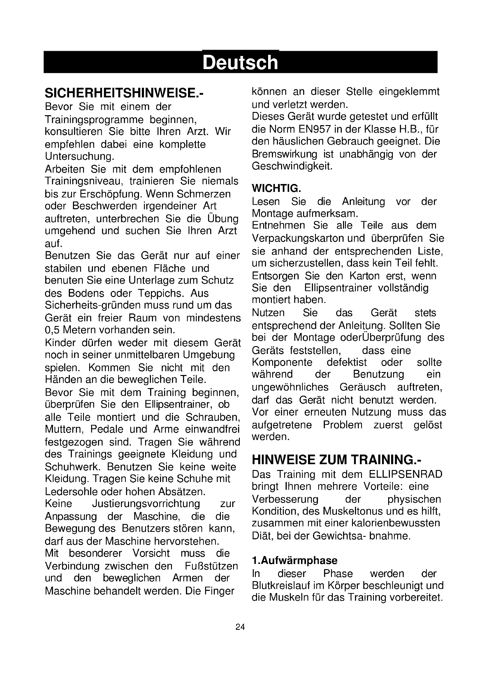 Deutsch SICHERHEITSHINWEISE.- Bevor Sie mit einem der Trainingsprogramme beginnen, konsultieren Sie bitte Ihren Arzt. Wir empfehlen dabei eine komplette Untersuchung. Arbeiten Sie mit dem empfohlenen Trainingsniveau, trainieren Sie niemals bis zur Erschöpfung. Wenn Schmerzen oder Beschwerden irgendeiner Art auftreten, unterbrechen Sie die Übung umgehend und suchen Sie Ihren Arzt auf. Benutzen Sie das Gerät nur auf einer stabilen und ebenen Fläche und benuten Sie eine Unterlage zum Schutz des Bodens oder Teppichs. Aus Sicherheits-gründen muss rund um das Gerät ein freier Raum von mindestens 0,5 Metern vorhanden sein. Kinder dürfen weder mit diesem Gerät noch in seiner unmittelbaren Umgebung spielen. Kommen Sie nicht mit den Händen an die beweglichen Teile. Bevor Sie mit dem Training beginnen, überprüfen Sie den Ellipsentrainer, ob alle Teile montiert und die Schrauben, Muttern, Pedale und Arme einwandfrei festgezogen sind. Tragen Sie während des Trainings geeignete Kleidung und Schuhwerk. Benutzen Sie keine weite Kleidung. Tragen Sie keine Schuhe mit Ledersohle oder hohen Absätzen. Keine Justierungsvorrichtung zur Anpassung der Maschine, die die Bewegung des Benutzers stören kann, darf aus der Maschine hervorstehen. Mit besonderer Vorsicht muss die Verbindung zwischen den Fußstützen und den beweglichen Armen der Maschine behandelt werden. Die Finger können an dieser Stelle eingeklemmt und verletzt werden. Dieses Gerät wurde getestet und erfüllt die Norm EN957 in der Klasse H.B., für den häuslichen Gebrauch geeignet. Die Bremswirkung ist unabhängig von der Geschwindigkeit. WICHTIG. Lesen Sie die Anleitung vor der Montage aufmerksam. Entnehmen Sie alle Teile aus dem Verpackungskarton und überprüfen Sie sie anhand der entsprechenden Liste, um sicherzustellen, dass kein Teil fehlt. Entsorgen Sie den Karton erst, wenn Sie den Ellipsentrainer vollständig montiert haben. Nutzen Sie das Gerät stets entsprechend der Anleitung. Sollten Sie bei der Montage oderÜberprüfung des Geräts feststellen, dass eine Komponente defektist oder sollte während der Benutzung ein ungewöhnliches Geräusch auftreten, darf das Gerät nicht benutzt werden. Vor einer erneuten Nutzung muss das aufgetretene Problem zuerst gelöst werden.