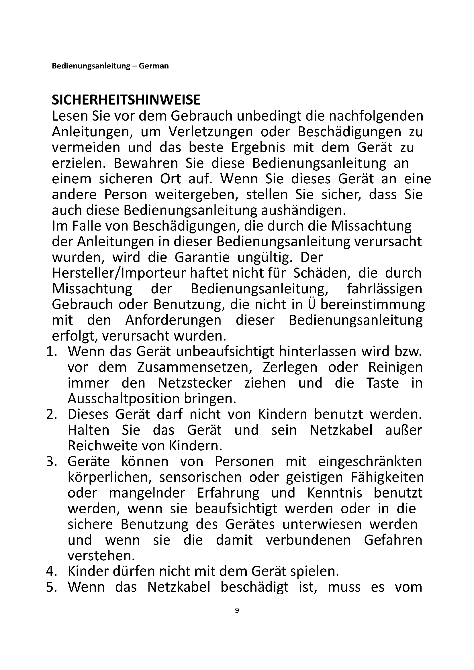 5. Wenn das Netzkabel beschädigt ist, muss es vom- 10 -