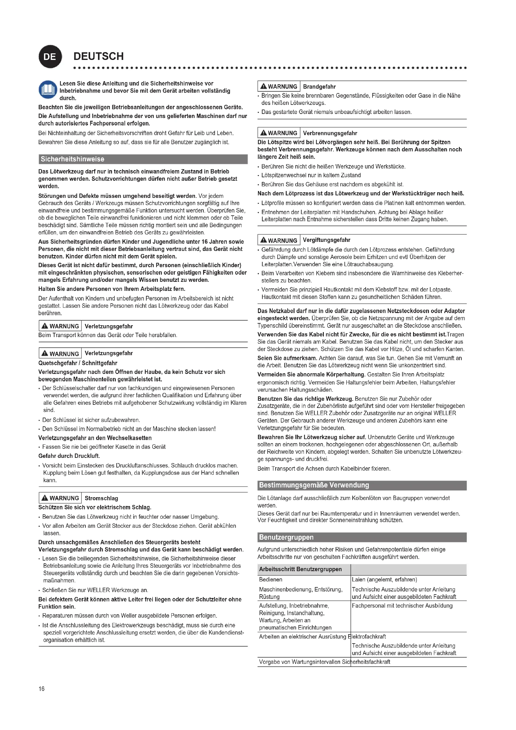 - Vermeiden Sie prinzipiell Hautkontakt mit dem Klebstoff bzw. mit der Lotpaste. Hautkontakt mit diesen Stoffen kann zu gesundheitlichen Schäden führen. Das Netzkabel darf nur in die dafür zugelassenen Netzsteckdosen oder Adapter eingesteckt werden. Überprüfen Sie, ob die Netzspannung mit der Angabe auf dem Typenschild übereinstimmt. Gerät nur ausgeschaltet an die Steckdose anschließen. Verwenden Sie das Kabel nicht für Zwecke, für die es nicht bestimmt ist.Tragen Sie das Gerät niemals am Kabel. Benutzen Sie das Kabel nicht, um den Stecker aus der Steckdose zu ziehen. Schützen Sie das Kabel vor Hitze, Öl und scharfen Kanten. Seien Sie aufmerksam. Achten Sie darauf, was Sie tun. Gehen Sie mit Vernunft an die Arbeit. Benutzen Sie das Lötwerkzeug nicht wenn Sie unkonzentriert sind. Vermeiden Sie abnormale Körperhaltung. Gestalten Sie Ihren Arbeitsplatz ergonomisch richtig. Vermeiden Sie Haltungsfehler beim Arbeiten, Haltungsfehler verursachen Haltungsschäden. Benutzen Sie das richtige Werkzeug. BenutzenSienurZubehöroder Zusatzgeräte,dieinderZubehörlisteaufgeführtsindodervomHerstellerfreigegeben sind.BenutzenSieWELLERZubehöroderZusatzgerätenuranoriginalWELLER Geräten.DerGebrauchandererWerkzeugeundanderenZubehörskanneine Verletzungsgefahr für Sie bedeuten. Bewahren Sie Ihr Lötwerkzeug sicher auf. Unbenutzte Geräte und Werkzeuge sollten an einem trockenen, hochgelegenen oder abgeschlossenen Ort, außerhalb der Reichweite von Kindern, abgelegt werden. Schalten Sie unbenutzte Lötwerkzeu- ge spannungs- und druckfrei. BeimTransportdieAchsendurchKabelbinderxieren. Bestimmungsgemäße Verwendung Die Lötanlage darf ausschließlich zum Kolbenlöten von Baugruppen verwendet werden. Dieses Gerät darf nur bei Raumtemperatur und in Innenräumen verwendet werden. Vor Feuchtigkeit und direkter Sonneneinstrahlung schützen. Benutzergruppen Aufgrund unterschiedlich hoher Risiken und Gefahrenpotentiale dürfen einige Arbeitsschritte nur von geschulten Fachkräften ausgeführt werden. Arbeitsschritt Benutzergruppen Bedienen Maschinenbedienung, Entstörung, Rüstung Laien (angelernt, erfahren) Technische Auszubildende unter Anleitung und Aufsicht einer ausgebildeten Fachkraft Aufstellung, Inbetriebnahme, Reinigung, Instandhaltung, Wartung, Arbeiten an pneumatischen Einrichtungen Fachpersonal mit technischer Ausbildung Arbeiten an elektrischer Ausrüstung Elektrofachkraft Technische Auszubildende unter Anleitung und Aufsicht einer ausgebildeten Fachkraft Vorgabe von Wartungsintervallen Sicherheitsfachkraft