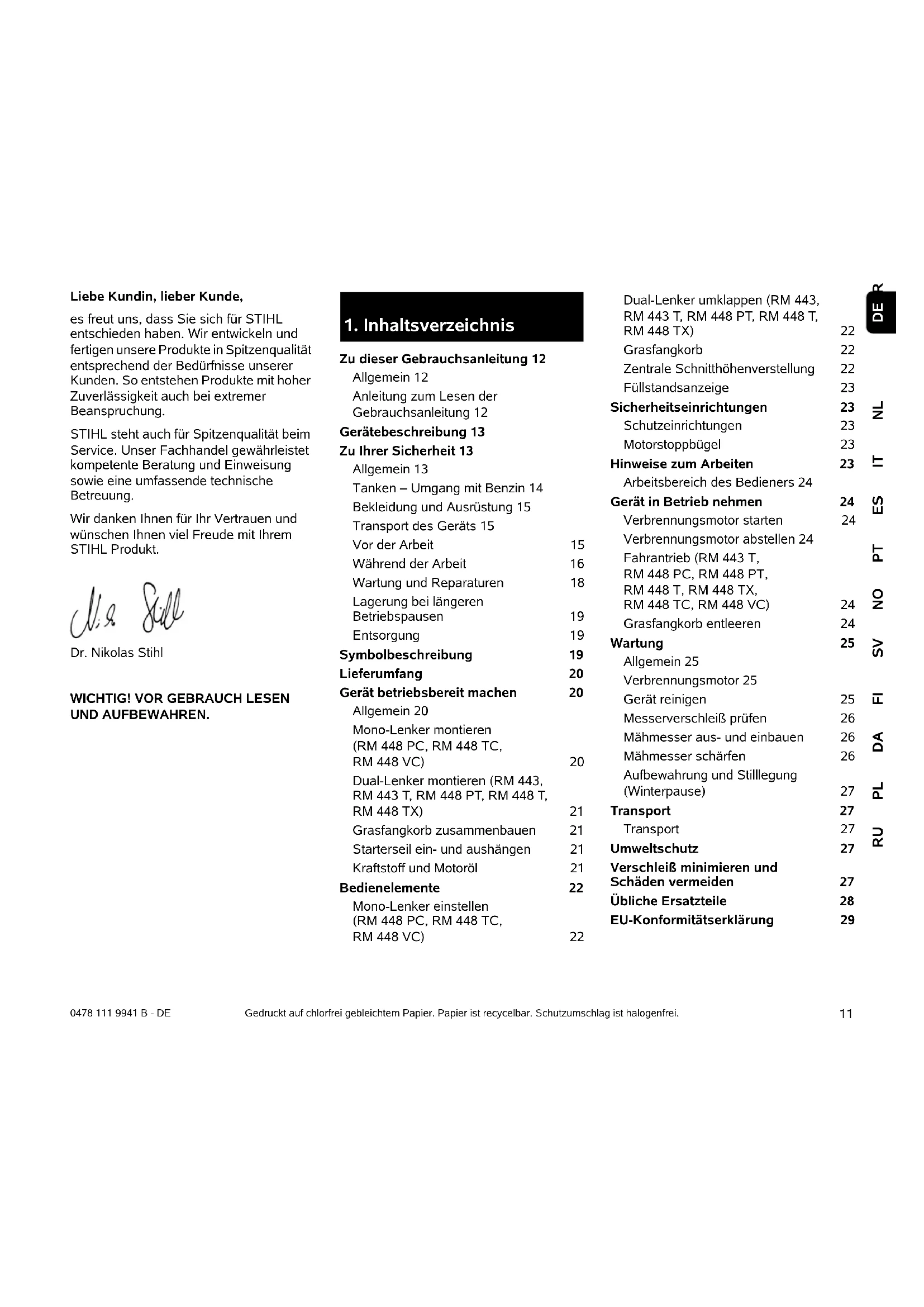 Zu dieser Gebrauchsanleitung 12 Allgemein 12 Anleitung zum Lesen der Gebrauchsanleitung 12 Gerätebeschreibung 13 Zu Ihrer Sicherheit 13 Allgemein 13 Tanken – Umgang mit Benzin 14 Bekleidung und Ausrüstung 15 Transport des Geräts 15 Vor der Arbeit 15 Während der Arbeit 16 Wartung und Reparaturen 18 Lagerung bei längeren Betriebspausen 19 Entsorgung 19 Symbolbeschreibung 19 Lieferumfang 20 Gerät betriebsbereit machen 20 Allgemein 20 Mono-Lenker montieren (RM 448 PC, RM 448 TC, RM 448 VC) 20 Dual-Lenker montieren (RM 443, RM 443 T, RM 448 PT, RM 448 T, RM 448 TX) 21 Grasfangkorb zusammenbauen 21 Starterseil ein- und aushängen 21 Kraftstoff und Motoröl 21 Bedienelemente 22 Mono-Lenker einstellen (RM 448 PC, RM 448 TC, RM 448 VC) 22 Dual-Lenker umklappen (RM 443, RM443T, RM448PT, RM448T, RM 448 TX) 22 Grasfangkorb 22 Zentrale Schnitthöhenverstellung 22 Füllstandsanzeige 23 Sicherheitseinrichtungen 23 Schutzeinrichtungen 23 Motorstoppbügel 23 Hinweise zum Arbeiten 23 Arbeitsbereich des Bedieners 24 Gerät in Betrieb nehmen 24 Verbrennungsmotor starten 24 Verbrennungsmotor abstellen 24 Fahrantrieb (RM 443 T, RM 448 PC, RM 448 PT, RM 448 T, RM 448 TX, RM 448 TC, RM 448 VC) 24 Grasfangkorb entleeren 24 Wartung 25 Allgemein 25 Verbrennungsmotor 25 Gerät reinigen 25 Messerverschleiß prüfen 26 Mähmesser aus- und einbauen 26 Mähmesser schärfen 26 Aufbewahrung und Stilllegung (Winterpause) 27 Transport 27 Transport 27 Umweltschutz 27 Verschleiß minimieren und Schäden vermeiden 27 Übliche Ersatzteile 28 EU-Konformitätserklärung 290478 111 9941 B - DE