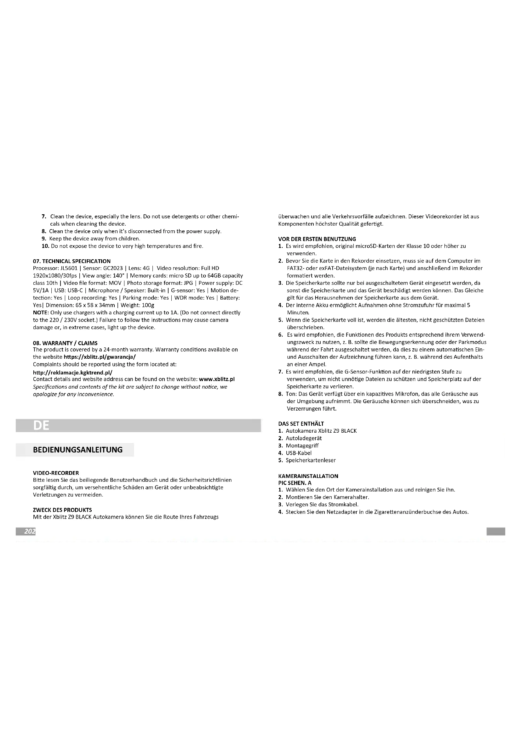 Für das Produkt gilt eine 24-monage Garane. Die Garanebedingungen nden Sie auf der Website hps://xblitz.pl/gwarancja/ Für die Meldung von Beschwerden ist das Formular zu verwenden, das unter folgender Adresse zu nden ist: hp://reklamacje.kgktrend.pl/ Die Kontaktdaten und die Adresse der Website nden Sie auf der Website: www.xblitz.pl Die technischen Daten und der Inhalt des Kits können ohne Vorankündigung geändert werden, wir entschuldigen uns für etwaige Unannehmlichkeiten.