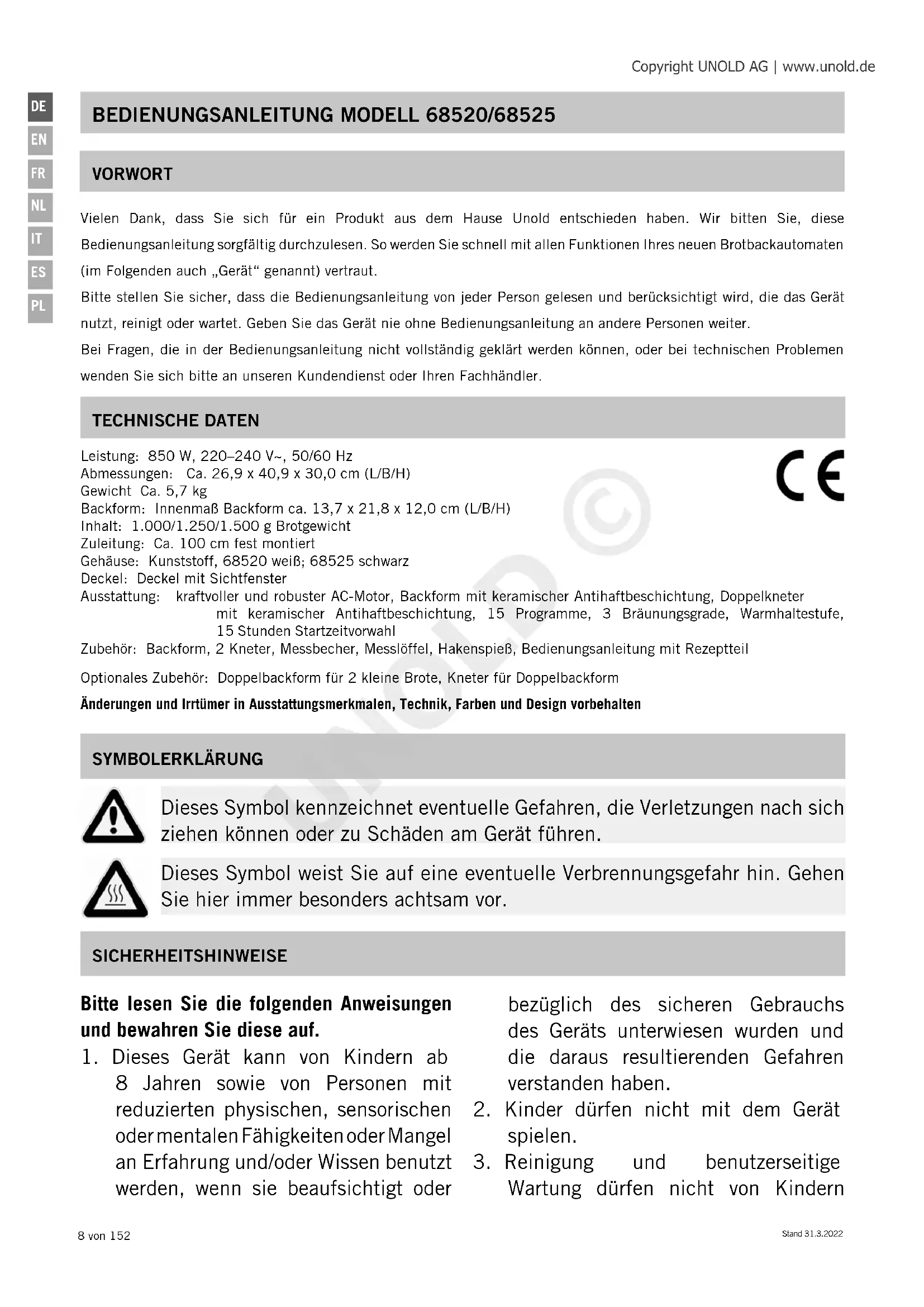 Wartung dürfen nicht von Kindern Leistung: 850 W, 220–240 V~, 50/60 Hz Abmessungen: Ca. 26,9 x 40,9 x 30,0 cm (L/B/H) Gewicht Ca. 5,7 kg Backform: Innenmaß Backform ca. 13,7 x 21,8 x 12,0 cm (L/B/H) Inhalt: 1.000/1.250/1.500 g Brotgewicht Zuleitung: Ca. 100 cm fest montiert Gehäuse: Kunststoff, 68520 weiß; 68525 schwarz Deckel: Deckel mit Sichtfenster Ausstattung: kraftvoller und robuster AC-Motor, Backform mit keramischer Antihaftbeschichtung, Doppelkneter mit keramischer Antihaftbeschichtung, 15 Programme, 3 Bräunungsgrade, Warmhaltestufe, 15 Stunden Startzeitvorwahl Zubehör: Backform, 2 Kneter, Messbecher, Messlöffel, Hakenspieß, Bedienungsanleitung mit Rezeptteil Optionales Zubehör: Doppelbackform für 2 kleine Brote, Kneter für Doppelbackform Änderungen und Irrtümer in Ausstattungsmerkmalen, Technik, Farben und Design vorbehalten SYMBOLERKLÄRUNG Dieses Symbol kennzeichnet eventuelle Gefahren, die Verletzungen nach sich ziehen können oder zu Schäden am Gerät führen. Dieses Symbol weist Sie auf eine eventuelle Verbrennungsgefahr hin. Gehen Sie hier immer besonders achtsam vor. VORWORT Vielen Dank, dass Sie sich für ein Produkt aus dem Hause Unold entschieden haben. Wir bitten Sie, diese Bedienungsanleitung sorgfältig durchzulesen. So werden Sie schnell mit allen Funktionen Ihres neuen Brotbackautomaten (im Folgenden auch „Gerät“ genannt) vertraut. Bitte stellen Sie sicher, dass die Bedienungsanleitung von jeder Person gelesen und berücksichtigt wird, die das Gerät nutzt, reinigt oder wartet. Geben Sie das Gerät nie ohne Bedienungsanleitung an andere Personen weiter. Bei Fragen, die in der Bedienungsanleitung nicht vollständig geklärt werden können, oder bei technischen Problemen wenden Sie sich bitte an unseren Kundendienst oder Ihren Fachhändler. Copyright UNOLD AG | www.unold.de UNOLD ©Stand 31.3.2022 9 von 152