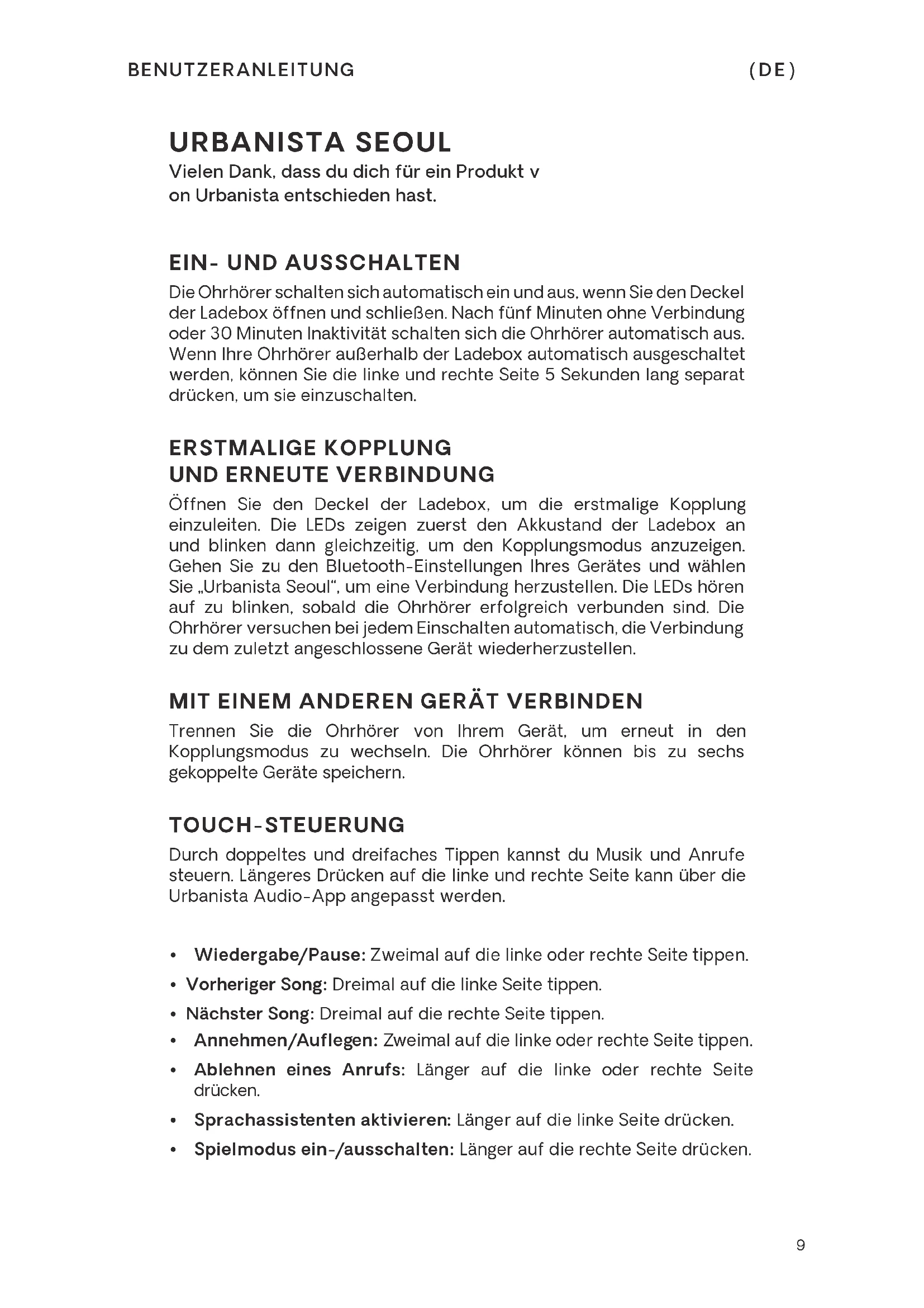 (ES)9 URBANISTA SEOUL Vielen Dank, dass du dich für ein Produkt v on Urbanista entschieden hast.