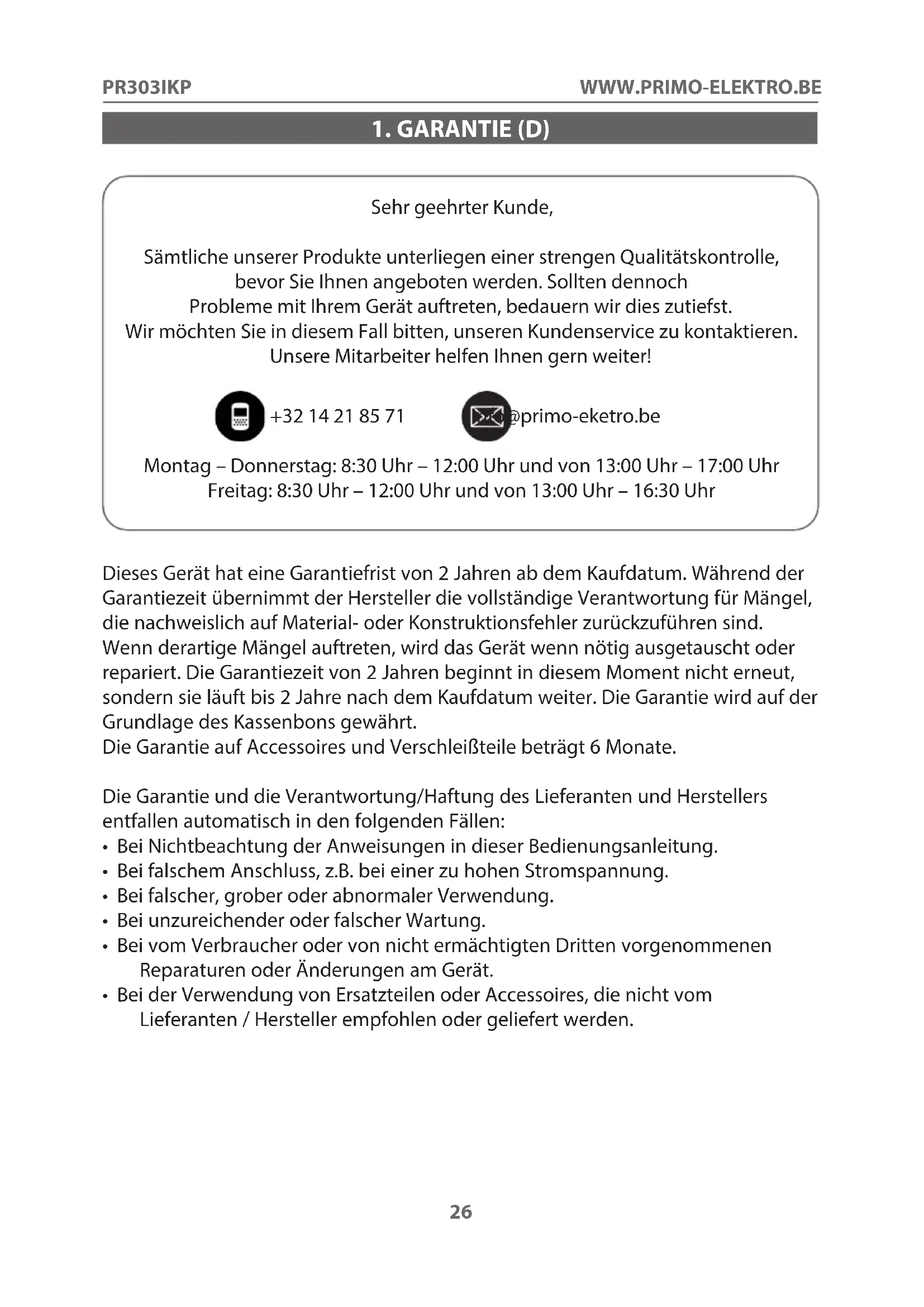 Sehr geehrter Kunde, Sämtliche unserer Produkte unterliegen einer strengen Qualitätskontrolle, bevor Sie Ihnen angeboten werden. Sollten dennoch Probleme mit Ihrem Gerät auftreten, bedauern wir dies zutiefst. Wir möchten Sie in diesem Fall bitten, unseren Kundenservice zu kontaktieren. Unsere Mitarbeiter helfen Ihnen gern weiter! +32 14 21 85 71 info@primo-eketro.be Montag – Donnerstag: 8:30 Uhr – 12:00 Uhr und von 13:00 Uhr – 17:00 Uhr Freitag: 8:30 Uhr – 12:00 Uhr und von 13:00 Uhr – 16:30 Uhr Dieses Gerät hat eine Garantiefrist von 2 Jahren ab dem Kaufdatum. Während der Garantiezeit übernimmt der Hersteller die vollständige Verantwortung für Mängel, die nachweislich auf Material- oder Konstruktionsfehler zurückzuführen sind. Wenn derartige Mängel auftreten, wird das Gerät wenn nötig ausgetauscht oder repariert. Die Garantiezeit von 2 Jahren beginnt in diesem Moment nicht erneut, sondern sie läuft bis 2 Jahre nach dem Kaufdatum weiter. Die Garantie wird auf der Grundlage des Kassenbons gewährt. Die Garantie auf Accessoires und Verschleißteile beträgt 6 Monate. Die Garantie und die Verantwortung/Haftung des Lieferanten und Herstellers entfallen automatisch in den folgenden Fällen: