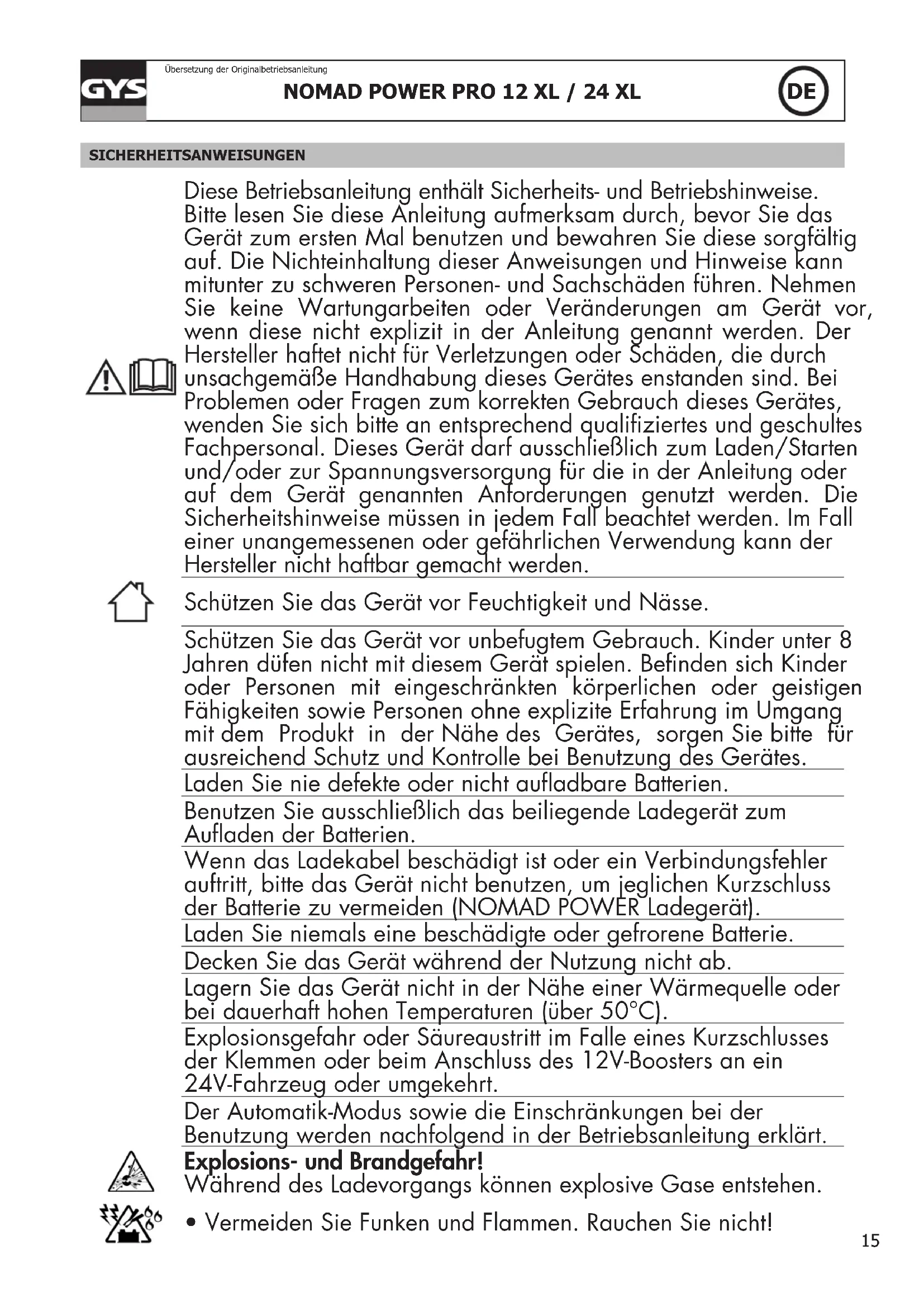 Übersetzung der Originalbetriebsanleitung SICHERHEITSANWEISUNGEN Diese Betriebsanleitung enthält Sicherheits- und Betriebshinweise. Bitte lesen Sie diese Anleitung aufmerksam durch, bevor Sie das Gerät zum ersten Mal benutzen und bewahren Sie diese sorgfältig auf. Die Nichteinhaltung dieser Anweisungen und Hinweise kann mitunter zu schweren Personen- und Sachschäden führen. Nehmen Sie keine Wartungarbeiten oder Veränderungen am Gerät vor, wenn diese nicht explizit in der Anleitung genannt werden. Der Hersteller haftet nicht für Verletzungen oder Schäden, die durch unsachgemäße Handhabung dieses Gerätes enstanden sind. Bei Problemen oder Fragen zum korrekten Gebrauch dieses Gerätes, wenden Sie sich bitte an entsprechend qualiziertes und geschultes Fachpersonal. Dieses Gerät darf ausschließlich zum Laden/Starten und/oder zur Spannungsversorgung für die in der Anleitung oder auf dem Gerät genannten Anforderungen genutzt werden. Die Sicherheitshinweise müssen in jedem Fall beachtet werden. Im Fall einer unangemessenen oder gefährlichen Verwendung kann der Hersteller nicht haftbar gemacht werden. Schützen Sie das Gerät vor Feuchtigkeit und Nässe. Schützen Sie das Gerät vor unbefugtem Gebrauch. Kinder unter 8 Jahren düfen nicht mit diesem Gerät spielen. Benden sich Kinder oder Personen mit eingeschränkten körperlichen oder geistigen Fähigkeiten sowie Personen ohne explizite Erfahrung im Umgang mit dem Produkt in der Nähe des Gerätes, sorgen Sie bitte für ausreichend Schutz und Kontrolle bei Benutzung des Gerätes. Laden Sie nie defekte oder nicht auadbare Batterien. Benutzen Sie ausschließlich das beiliegende Ladegerät zum Auaden der Batterien. Wenn das Ladekabel beschädigt ist oder ein Verbindungsfehler auftritt, bitte das Gerät nicht benutzen, um jeglichen Kurzschluss der Batterie zu vermeiden (NOMAD POWER Ladegerät). Laden Sie niemals eine beschädigte oder gefrorene Batterie. Decken Sie das Gerät während der Nutzung nicht ab. Lagern Sie das Gerät nicht in der Nähe einer Wärmequelle oder bei dauerhaft hohen Temperaturen (über 50°C). Explosionsgefahr oder Säureaustritt im Falle eines Kurzschlusses der Klemmen oder beim Anschluss des 12V-Boosters an ein 24V-Fahrzeug oder umgekehrt. Der Automatik-Modus sowie die Einschränkungen bei der Benutzung werden nachfolgend in der Betriebsanleitung erklärt. Explosions- und Brandgefahr! Während des Ladevorgangs können explosive Gase entstehen.