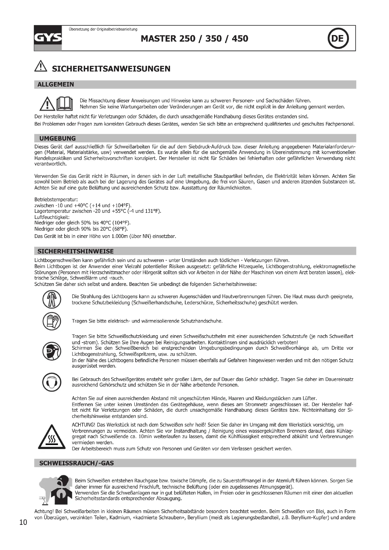 Translation of the original instructionsSICHERHEITSANWEISUNGEN ALLGEMEIN Die Missachtung dieser Anweisungen und Hinweise kann zu schweren Personen- und Sachschäden führen. Nehmen Sie keine Wartungarbeiten oder Veränderungen am Gerät vor, die nicht explizit in der Anleitung gennant werden. Der Hersteller haftet nicht für Verletzungen oder Schäden, die durch unsachgemäße Handhabung dieses Gerätes enstanden sind. Bei Problemen oder Fragen zum korrekten Gebrauch dieses Gerätes, wenden Sie sich bitte an entsprechend qualiziertes und geschultes Fachpersonal. UMGEBUNG Dieses Gerät darf ausschließlich für Schweißarbeiten für die auf dem Siebdruck-Aufdruck bzw. dieser Anleitung angegebenen Materialanforderun- gen (Material, Materialstärke, usw) verwendet werden. Es wurde allein für die sachgemäße Anwendung in Übereinstimmung mit konventionellen Handelspraktiken und Sicherheitsvorschriften konzipiert. Der Hersteller ist nicht für Schäden bei fehlerhaften oder gefährlichen Verwendung nicht verantwortlich. Verwenden Sie das Gerät nicht in Räumen, in denen sich in der Luft metallische Staubpartikel benden, die Elektrizität leiten können. Achten Sie sowohl beim Betrieb als auch bei der Lagerung des Gerätes auf eine Umgebung, die frei von Säuren, Gasen und anderen ätzenden Substanzen ist. Achten Sie auf eine gute Belüftung und ausreichenden Schutz bzw. Ausstattung der Räumlichkeiten.Betriebstemperatur:zwischen -10 und +40°C (+14 und +104°F).Lagertemperatur zwischen -20 und +55°C (-4 und 131°F).Luftfeuchtigkeit:Niedriger oder gleich 50% bis 40°C (104°F).Niedriger oder gleich 90% bis 20°C (68°F).Das Gerät ist bis in einer Höhe von 1.000m (über NN) einsetzbar. SICHERHEITSHINWEISE Lichtbogenschweißen kann gefährlich sein und zu schweren - unter Umständen auch tödlichen - Verletzungen führen. Beim Lichtbogen ist der Anwender einer Vielzahl potentieller Risiken ausgesetzt: gefährliche Hitzequelle, Lichtbogenstrahlung, elektromagnetische Störungen (Personen mit Herzschnittmacher oder Hörgerät sollten sich vor Arbeiten in der Nähe der Maschinen von einem Arzt beraten lassen), elek- trische Schläge, Schweißlärm und -rauch.Schützen Sie daher sich selbst und andere. Beachten Sie unbedingt die folgenden Sicherheitshinweise: Die Strahlung des Lichtbogens kann zu schweren Augenschäden und Hautverbrennungen führen. Die Haut muss durch geeignete, trockene Schutzbekleidung (Schweißerhandschuhe, Lederschürze, Sicherheitsschuhe) geschützt werden.Tragen Sie bitte elektrisch- und wärmeisolierende Schutzhandschuhe. Tragen Sie bitte Schweißschutzkleidung und einen Schweißschutzhelm mit einer ausreichenden Schutzstufe (je nach Schweißart und -strom). Schützen Sie Ihre Augen bei Reinigungsarbeiten. Kontaktlinsen sind ausdrücklich verboten! Schirmen Sie den Schweißbereich bei enstprechenden Umgebungsbedingungen durch Schweißvorhänge ab, um Dritte vor Lichtbogenstrahlung, Schweißspritzern, usw. zu schützen. In der Nähe des Lichtbogens bendliche Personen müssen ebenfalls auf Gefahren hingewiesen werden und mit den nötigen Schutz ausgerüstet werden. Bei Gebrauch des Schweißgerätes ensteht sehr großer Lärm, der auf Dauer das Gehör schädigt. Tragen Sie daher im Dauereinsatz ausreichend Gehörschutz und schützen Sie in der Nähe arbeitende Personen.Achten Sie auf einen ausreichenden Abstand mit ungeschützten Hände, Haaren und Kleidungstücken zum Lüfter. Entfernen Sie unter keinen Umständen das Gerätegehäuse, wenn dieses am Stromnetz angeschlossen ist. Der Hersteller haf- tet nicht für Verletzungen oder Schäden, die durch unsachgemäße Handhabung dieses Gerätes bzw. Nichteinhaltung der Si- cherheitshinweise entstanden sind.ACHTUNG! Das Werkstück ist nach dem Schweißen sehr heiß! Seien Sie daher im Umgang mit dem Werkstück vorsichtig, um Verbrennungen zu vermeiden. Achten Sie vor Instandhaltung / Reinigung eines wassergekühlten Brenners darauf, dass Kühlag- gregat nach Schweißende ca. 10min weiterlaufen zu lassen, damit die Kühlüssigkeit entsprechend abkühlt und Verbrennungen vermieden werden.Der Arbeitsbereich muss zum Schutz von Personen und Geräten vor dem Verlassen gesichert werden. SCHWEISSRAUCH/-GAS Beim Schweißen entstehen Rauchgase bzw. toxische Dämpfe, die zu Sauerstomangel in der Atemluft führen können. Sorgen Sie daher immer für ausreichend Frischluft, technische Belüftung (oder ein zugelassenes Atmungsgerät). Verwenden Sie die Schweßanlagen nur in gut belüfteten Hallen, im Freien oder in geschlossenen Räumen mit einer den aktuellen Sicherheitsstandards entsprechender Absaugung. Achtung! Bei Schweißarbeiten in kleinen Räumen müssen Sicherheitsabände besonders beachtet werden. Beim Schweißen von Blei, auch in Form von Überzügen, verzinkten Teilen, Kadmium, «kadmierte Schrauben», Beryllium (mei als Legierungsbeandteil, z.B. Beryllium-Kupfer) und andere