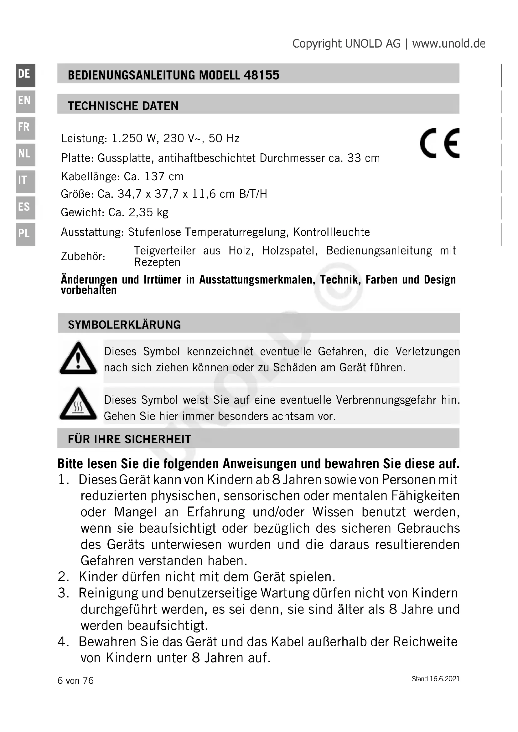 von Kindern unter 8 Jahren auf. SYMBOLERKLÄRUNG Dieses Symbol kennzeichnet eventuelle Gefahren, die Verletzungen nach sich ziehen können oder zu Schäden am Gerät führen. Dieses Symbol weist Sie auf eine eventuelle Verbrennungsgefahr hin. Gehen Sie hier immer besonders achtsam vor. Leistung: 1.250 W, 230 V~, 50 Hz Platte: Gussplatte, antihaftbeschichtet Durchmesser ca. 33 cm Kabellänge: Ca. 137 cm Größe: Ca. 34,7 x 37,7 x 11,6 cm B/T/H Gewicht: Ca. 2,35 kg Ausstattung: Stufenlose Temperaturregelung, Kontrollleuchte Zubehör: Teigverteiler aus Holz, Holzspatel, Bedienungsanleitung mit Rezepten Änderungen und Irrtümer in Ausstattungsmerkmalen, Technik, Farben und Design vorbehalten Copyright UNOLD AG | www.unold.de UNOLD ©Stand 16.6.2021 7 von 76