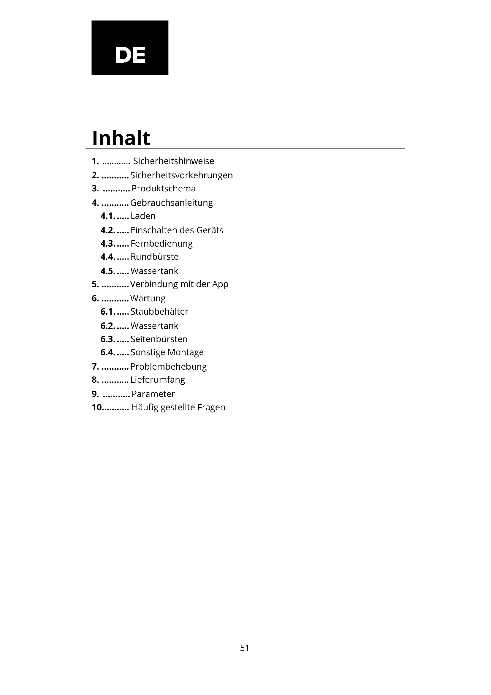 4.1. ..... Laden 4.2. ..... Einschalten des Geräts 4.3. ..... Fernbedienung 4.4. ..... Rundbürste 4.5. ..... Wassertank