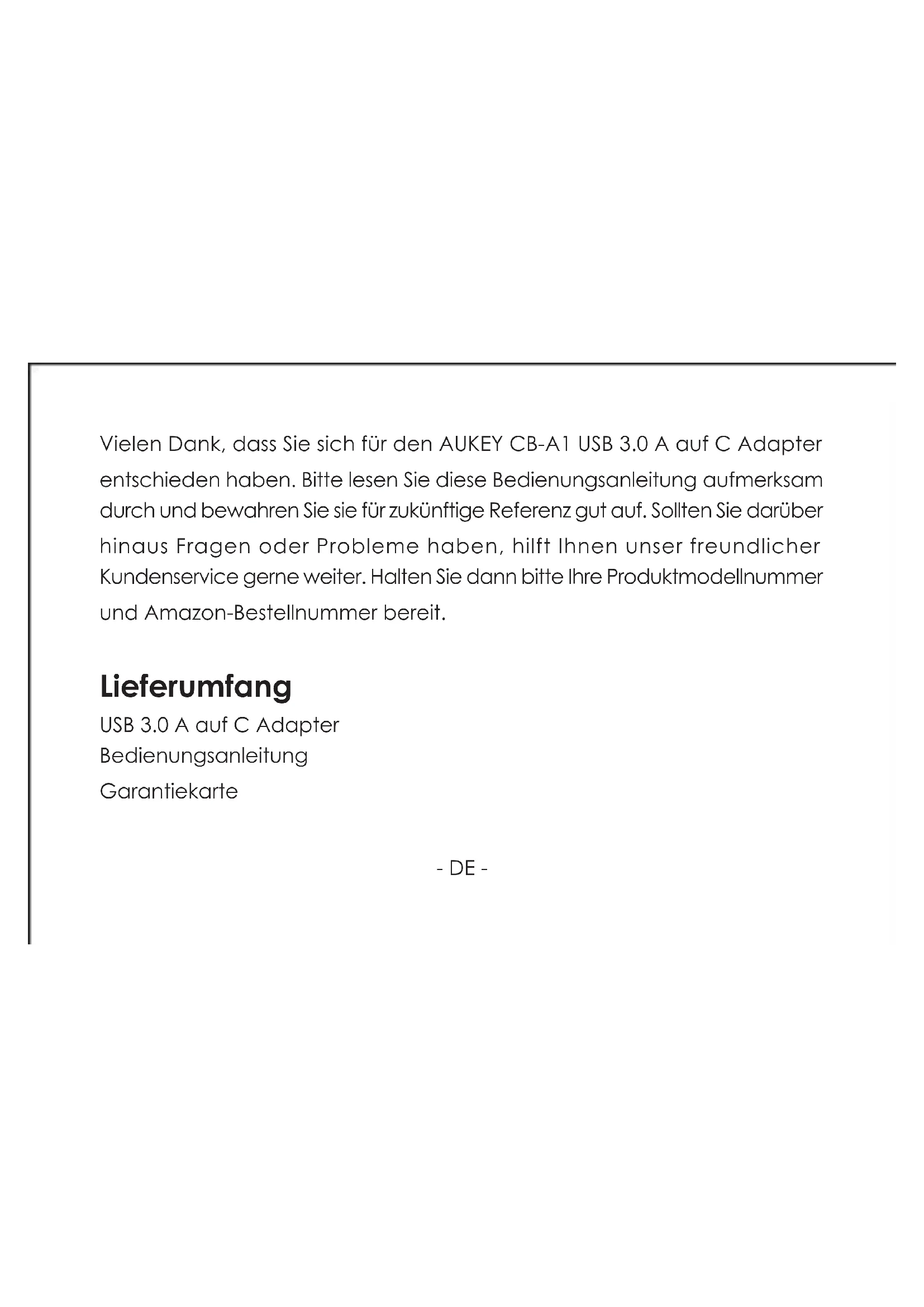 - Please note, AUKEY can only provide after sales service for products purchased directly from AUKEY. If you have purchased from a different seller, please contact them directly for service or warranty issues.- DE - Vielen Dank, dass Sie sich für den AUKEY CB-A1 USB 3.0 A auf C Adapter entschieden haben. Bitte lesen Sie diese Bedienungsanleitung aufmerksam durch und bewahren Sie sie für zukünftige Referenz gut auf. Sollten Sie darüber hinaus Fragen oder Probleme haben, hilft Ihnen unser freundlicher Kundenservice gerne weiter. Halten Sie dann bitte Ihre Produktmodellnummer und Amazon-Bestellnummer bereit. Lieferumfang USB 3.0 A auf C Adapter Bedienungsanleitung Garantiekarte- DE - Modell Anschluss Abmessungen Gewicht CB-A1 USB-C, USB-A 35 × 15,8 × 8,27mm / 1,2” × 0,62” × 0,32” 9g / 0,32oz Spezifikationen- DE - Garantie & Kundenservice Bei Fragen, Problemen oder Garantieansprüchen kontaktieren Sie uns bitte unter der jeweiligen Adresse. Bitte geben Sie Ihre Amazon-Bestellnummer und die Produktmodellnummer an. Bestellungen über Amazon Europa: support.eu@aukey.com
