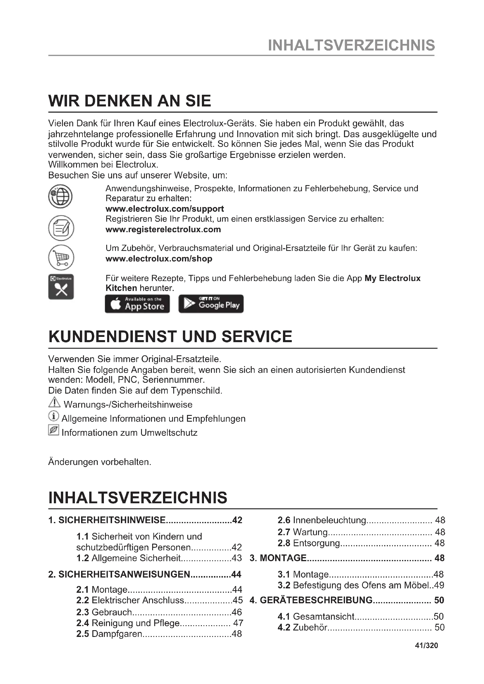 Vielen Dank für Ihren Kauf eines Electrolux-Geräts. Sie haben ein Produkt gewählt, das jahrzehntelange professionelle Erfahrung und Innovation mit sich bringt. Das ausgeklügelte und stilvolle Produkt wurde für Sie entwickelt. So können Sie jedes Mal, wenn Sie das Produkt verwenden, sicher sein, dass Sie großartige Ergebnisse erzielen werden. Willkommen bei Electrolux. Besuchen Sie uns auf unserer Website, um: Anwendungshinweise, Prospekte, Informationen zu Fehlerbehebung, Service und Reparatur zu erhalten: www.electrolux.com/support Registrieren Sie Ihr Produkt, um einen erstklassigen Service zu erhalten: www.registerelectrolux.com Um Zubehör, Verbrauchsmaterial und Original-Ersatzteile für Ihr Gerät zu kaufen: www.electrolux.com/shop Für weitere Rezepte, Tipps und Fehlerbehebung laden Sie die App My Electrolux Kitchen herunter.