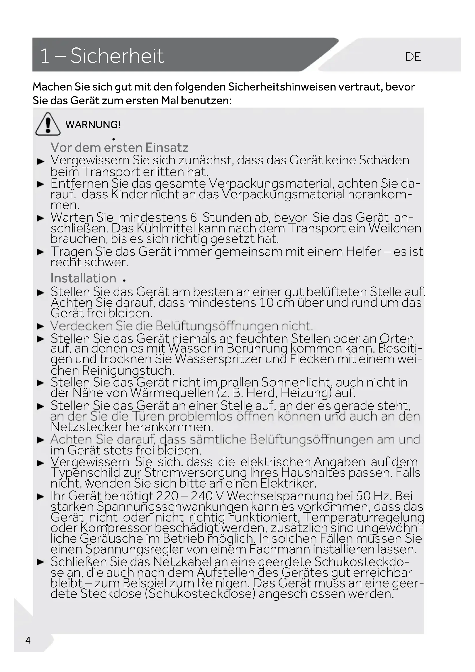 Machen Sie sich gut mit den folgenden Sicherheitshinweisen vertraut, bevor Sie das Gerät zum ersten Mal benutzen:DE 1 – Sicherheit