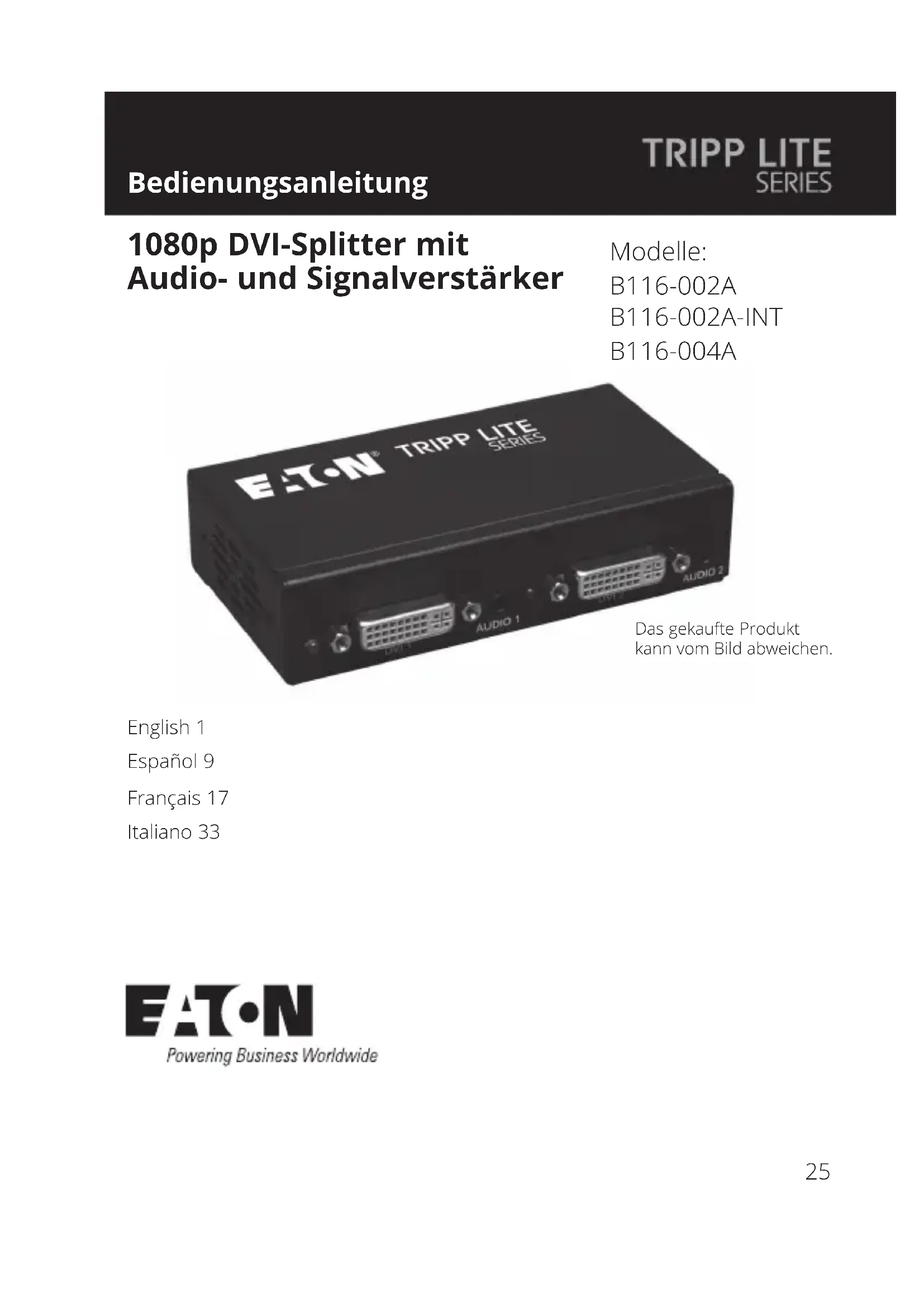 B116-004A 1080p DVI-Splitter mit Audio- und Signalverstärker English 1 Español 9 Français 17 Italiano 3326