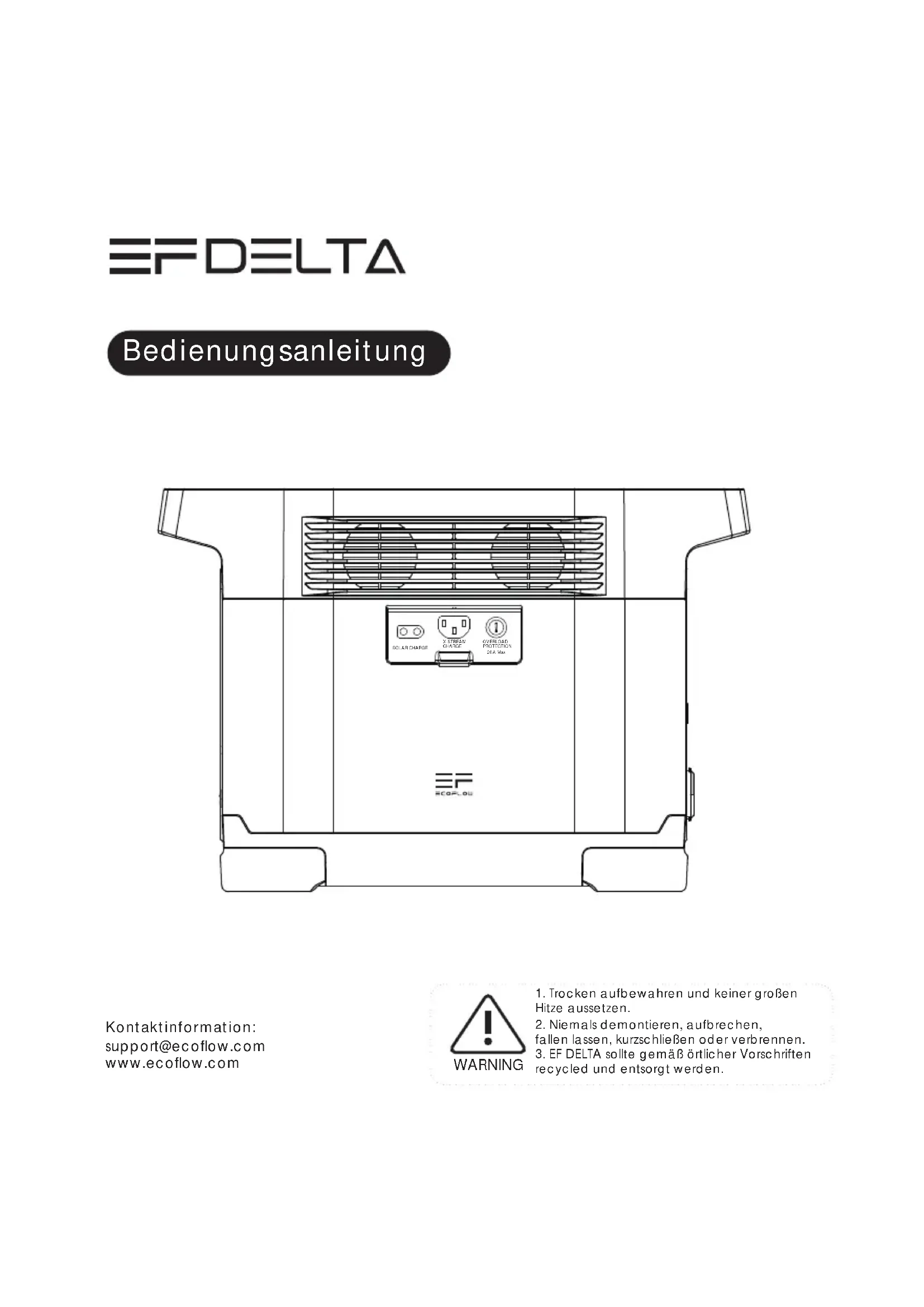 OPTIONAL EF DELTA Tasche Bedienungsanleitung und Garantiekarte Solar-Ladekabel (MC4 to XT60 Eingang) (Eingang) 1.5m Kfz-Ladekabel 1.5m AC-Kabel (Eingang) (Ausgang ) Kfz-Batterieklemmen Kann erworben werden von ecoflow.com Wenn Sie das Gerät sofort nach vollständiger Entladung aufzuladen versuchen, zeigt das Gerät Überhitzungsschutz-Er- mahnung an. Dies ist normal. Bitte kühlen Sie das Gerät zur Sicherheit für 2-3 Stunden vor dem Wiederaufladen. Warnung! Laden Sie das Gerät nicht sofort auf, nachdem es vollständig entladen wurde. Bitte kühlen Sie die Batterie zur Sicherheit für 2-3 Stunden vor dem Wiederaufladen! EF DELTAContattaci: support@ecoflow.com www.ecoflow.com User Guide