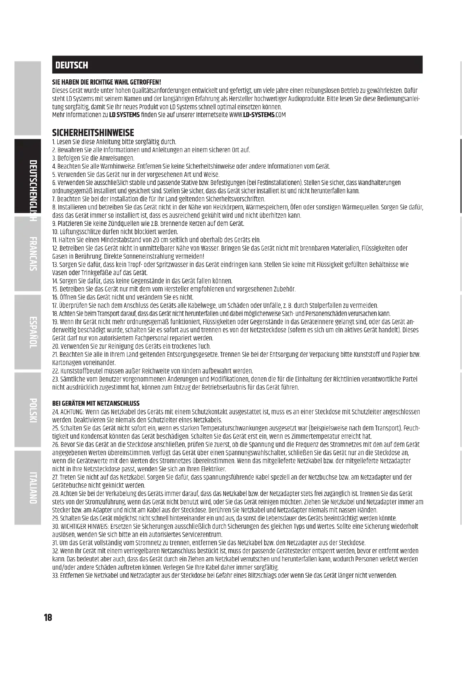 24. ACHTUNG: Wenn das Netzkabel des Geräts mit einem Schutzkontakt ausgestattet ist, muss es an einer Steckdose mit Schutzleiter angeschlossen werden. Deaktivieren Sie niemals den Schutzleiter eines Netzkabels. 25. Schalten Sie das Gerät nicht sofort ein, wenn es starken Temperaturschwankungen ausgesetzt war (beispielsweise nach dem Transport). Feuch- tigkeit und Kondensat könnten das Gerät beschädigen. Schalten Sie das Gerät erst ein, wenn es Zimmertemperatur erreicht hat. 26. Bevor Sie das Gerät an die Steckdose anschließen, prüfen Sie zuerst, ob die Spannung und die Frequenz des Stromnetzes mit den auf dem Gerät angegebenen Werten übereinstimmen. Verfügt das Gerät über einen Spannungswahlschalter, schließen Sie das Gerät nur an die Steckdose an, wenn die Gerätewerte mit den Werten des Stromnetzes übereinstimmen. Wenn das mitgelieferte Netzkabel bzw. der mitgelieferte Netzadapter nicht in Ihre Netzsteckdose passt, wenden Sie sich an Ihren Elektriker. 27. Treten Sie nicht auf das Netzkabel. Sorgen Sie dafür, dass spannungsführende Kabel speziell an der Netzbuchse bzw. am Netzadapter und der Gerätebuchse nicht geknickt werden. 28. Achten Sie bei der Verkabelung des Geräts immer darauf, dass das Netzkabel bzw. der Netzadapter stets frei zugänglich ist. Trennen Sie das Gerät stets von der Stromzuführung, wenn das Gerät nicht benutzt wird, oder Sie das Gerät reinigen möchten. Ziehen Sie Netzkabel und Netzadapter immer am Stecker bzw. am Adapter und nicht am Kabel aus der Steckdose. Berühren Sie Netzkabel und Netzadapter niemals mit nassen Händen. 29. Schalten Sie das Gerät möglichst nicht schnell hintereinander ein und aus, da sonst die Lebensdauer des Geräts beeinträchtigt werden könnte. 30. WICHTIGER HINWEIS: Ersetzen Sie Sicherungen ausschließlich durch Sicherungen des gleichen Typs und Wertes. Sollte eine Sicherung wiederholt auslösen, wenden Sie sich bitte an ein autorisiertes Servicezentrum. 31. Um das Gerät vollständig vom Stromnetz zu trennen, entfernen Sie das Netzkabel bzw. den Netzadapter aus der Steckdose. 32. Wenn Ihr Gerät mit einem verriegelbaren Netzanschluss bestückt ist, muss der passende Gerätestecker entsperrt werden, bevor er entfernt werden kann. Das bedeutet aber auch, dass das Gerät durch ein Ziehen am Netzkabel verrutschen und herunterfallen kann, wodurch Personen verletzt werden und/oder andere Schäden auftreten können. Verlegen Sie Ihre Kabel daher immer sorgfältig. 33. Entfernen Sie Netzkabel und Netzadapter aus der Steckdose bei Gefahr eines Blitzschlags oder wenn Sie das Gerät länger nicht verwenden.19 DEUTSCHFRANCAIS ESPAÑOL ENGLISH ITALIANO POLSKI ACHTUNG Entfernen Sie niemals die Abdeckung, da sonst das Risiko eines elektrischen Schlages besteht. Im Inneren des Geräts benden sich keine Teile, die vom Bediener repariert oder gewartet werden können. Lassen Sie Wartung und Reparaturen ausschließlich von qualiziertem Servicepersonal durchführen. Das gleichseitige Dreieck mit Blitzsymbol warnt vor nichtisolierten, gefährlichen Spannungen im Geräteinneren, die einen elektrischen Schlag verursachen können. Das gleichseitige Dreieck mit Ausrufungszeichen kennzeichnet wichtige Bedienungs- und Wartungshinweise. Warnung! Dieses Symbol kennzeichnet heiße Oberächen. Während des Betriebs können bestimmte Teile des Gehäuses heiß werden. Berühren oder transportieren Sie das Gerät nach einem Einsatz erst nach einer Abkühlzeit von mindestens 10 Minuten. Warnung! Dieses Gerät ist für eine Nutzung bis zu einer Höhe von maximal 2000 Metern über dem Meeresspiegel bestimmt. Warnung! Dieses Gerät ist nicht für den Einsatz in tropischen Klimazonen bestimmt. ACHTUNG HOHE LAUTSTÄRKEN BEI AUDIOPRODUKTEN! Dieses Gerät ist für den professionellen Einsatz vorgesehen. Der kommerzielle Betrieb dieses Geräts unterliegt den jeweils gültigen nationalen Vorschriften und Richtlinien zur Unfallverhütung. Als Hersteller ist Adam Hall gesetzlich verpichtet, Sie ausdrücklich auf mögliche Gesundheitsrisik- en hinzuweisen. Gehörschäden durch hohe Lautstärken und Dauerbelastung: Bei der Verwendung dieses Produkts können hohe Schalldruckpegel (SPL) erzeugt werden, die bei Künstlern, Mitarbeitern und Zuschauern zu irreparablen Gehörschäden führen können. Vermeiden Sie länger anhalten- de Belastung durch hohe Lautstärken über 90 dB. EINFÜHRUNG In Deutschland entwickelt, bieten die UHF-Diversity-Funksysteme der U300®-Serie eine überzeugende Audio-Performance. Sie erzielen eine Reichweite von 100 m bei idealen Bedingungen und sind zum Betrieb in 5 Frequenzbändern erhältlich. Dabei lassen sich jeweils bis zu sechs U300®-Systeme gleich- zeitig einsetzen. Zur schnellen, problemlosen Funkverbindung dient eine bequeme One-Touch-Synchronisation von Sender und Empfänger über Infrarot, und die Rauschsperre mit Pilotton gewährleistet eine störungssichere Funktion.