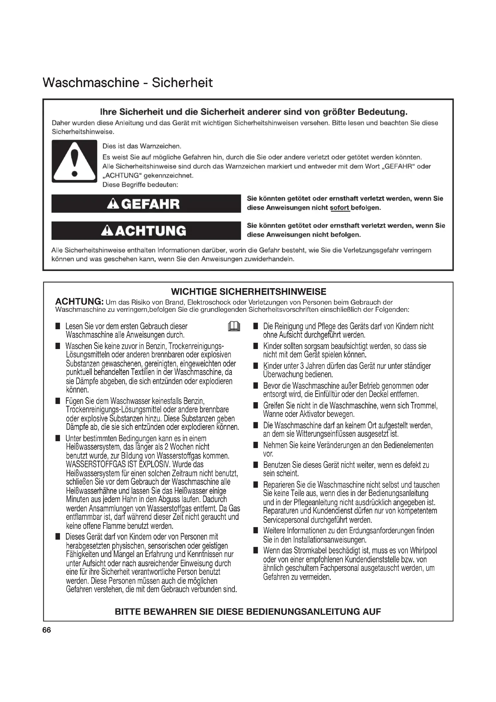 n Lesen Sie vor dem ersten Gebrauch dieser Waschmaschine alle Anweisungen durch. n Waschen Sie keine zuvor in Benzin, Trockenreinigungs- Lösungsmitteln oder anderen brennbaren oder explosiven Substanzen gewaschenen, gereinigten, eingeweichten oder punktuell behandelten Textilien in der Waschmaschine, da sie Dämpfe abgeben, die sich entzünden oder explodieren können. n Fügen Sie dem Waschwasser keinesfalls Benzin, Trockenreinigungs-Lösungsmittel oder andere brennbare oder explosive Substanzen hinzu. Diese Substanzen geben Dämpfe ab, die sie sich entzünden oder explodieren können. n Unter bestimmten Bedingungen kann es in einem Heißwassersystem, das länger als 2 Wochen nicht benutzt wurde, zur Bildung von Wasserstoffgas kommen. WASSERSTOFFGAS IST EXPLOSIV. Wurde das Heißwassersystem für einen solchen Zeitraum nicht benutzt, schließen Sie vor dem Gebrauch der Waschmaschine alle Heißwasserhähne und lassen Sie das Heißwasser einige Minuten aus jedem Hahn in den Abguss laufen. Dadurch werden Ansammlungen von Wasserstoffgas entfernt. Da Gas entammbar ist, darf während dieser Zeit nicht geraucht und keine offene Flamme benutzt werden. n Dieses Gerät darf von Kindern oder von Personen mit herabgesetzten physischen, sensorischen oder geistigen Fähigkeiten und Mangel an Erfahrung und Kenntnissen nur unter Aufsicht oder nach ausreichender Einweisung durch eine für ihre Sicherheit verantwortliche Person benutzt werden. Diese Personen müssen auch die möglichen Gefahren verstehen, die mit dem Gebrauch verbunden sind.