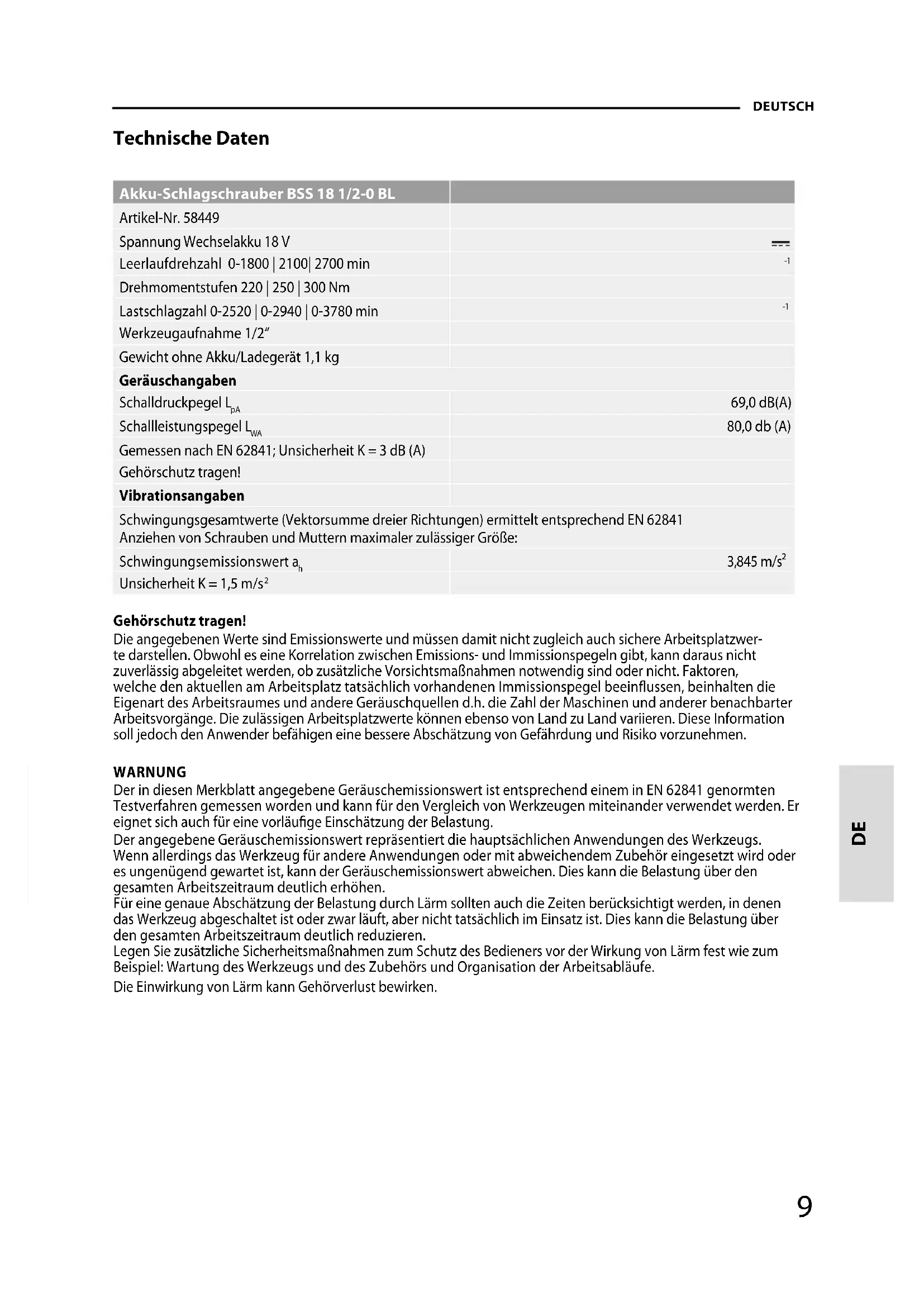 Technische Daten Akku-Schlagschrauber BSS 18 1/2-0 BL Artikel-Nr. 58449 Spannung Wechselakku 18 V Leerlaufdrehzahl 0-1800 | 2100| 2700 min