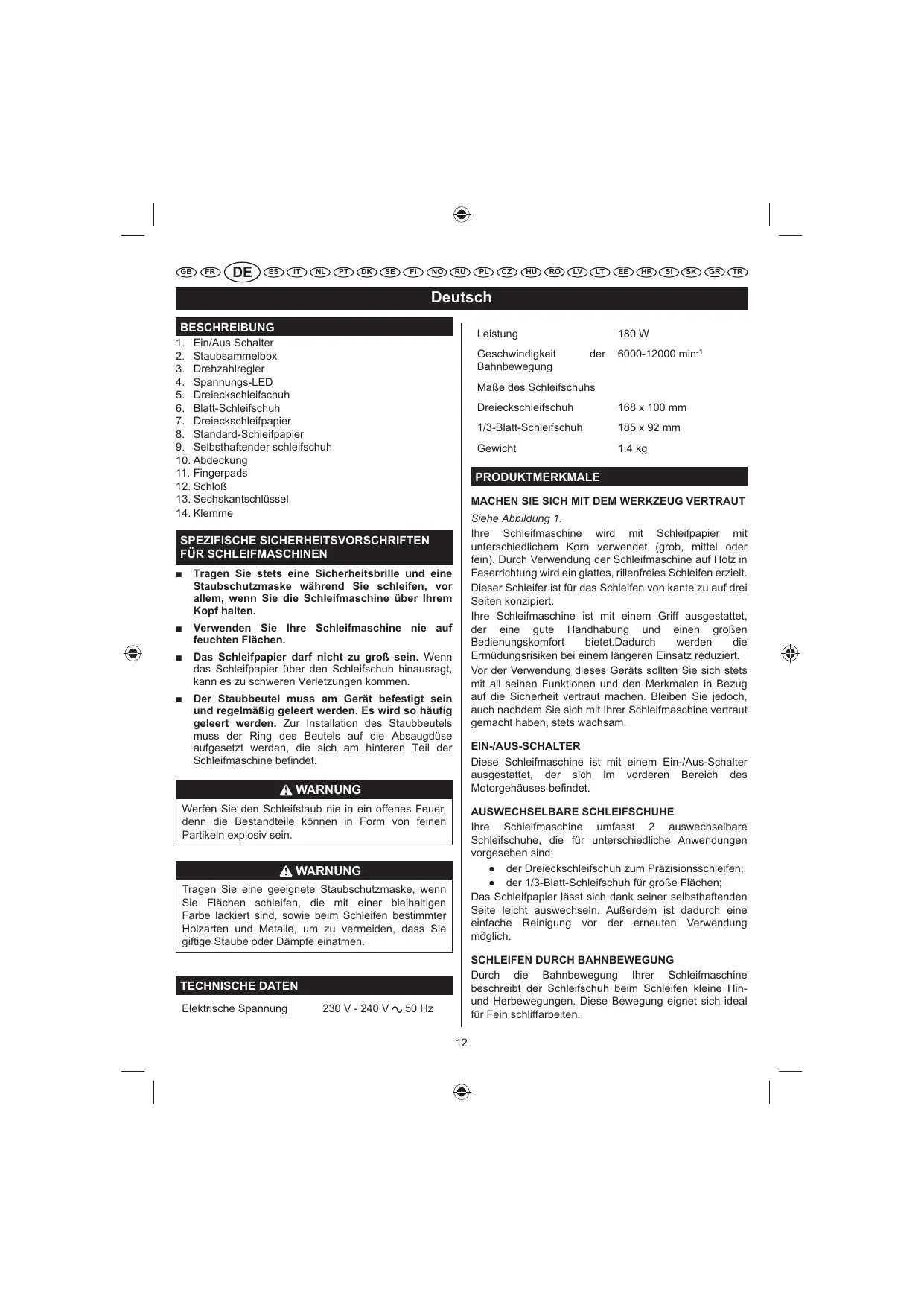 Die mit Ihrer Schleifmaschine gelieferten Schleifpapiere sind wiederverwendbar. Sie müssen daher regelmäßig gereinigt werden, um den Staub und die Partikel zu entfernen, die sich bei den verschiedenen Schleifoperationen auf der Fläche ansammeln können. Reiben Sie die Schleifpapiere zur Reinigung mit einem kompakten Kautschukblock ab. Sie können hierfür beispielsweise eine saubere Schuhsohle verwenden. Bitte lesen Sie die Anweisungen sorgfältig, bevor Sie das Gerät einschalten. Elektrische Geräte sollten nicht mit dem übrigen Müll entsorgt werden. Bitte entsorgen Sie diese an den entsprechenden Entsorgungsstellen. Wenden Sie sich an die örtliche Behörde oder Ihren Händler, um Auskunft über die Entsorgung zu erhalten. WARNUNG Entfernen Sie das Schleifpapier oder den Schleifschuh vor der Reinigung stets vom Schuh der Schleifmaschine. Die Missachtung dieser Vorschrift kann zu schweren Körperverletzungen führen. UMWELTSCHUTZ Recyceln Sie die Rohstoffe anstatt sie in die Haushaltsabfälle zu geben. Zum Schutz der Umwelt müssen das Gerät, die Zubehörteile und die Verpackungen getrennt entsorgt werden. SYMBOL Sicherheitswarnung