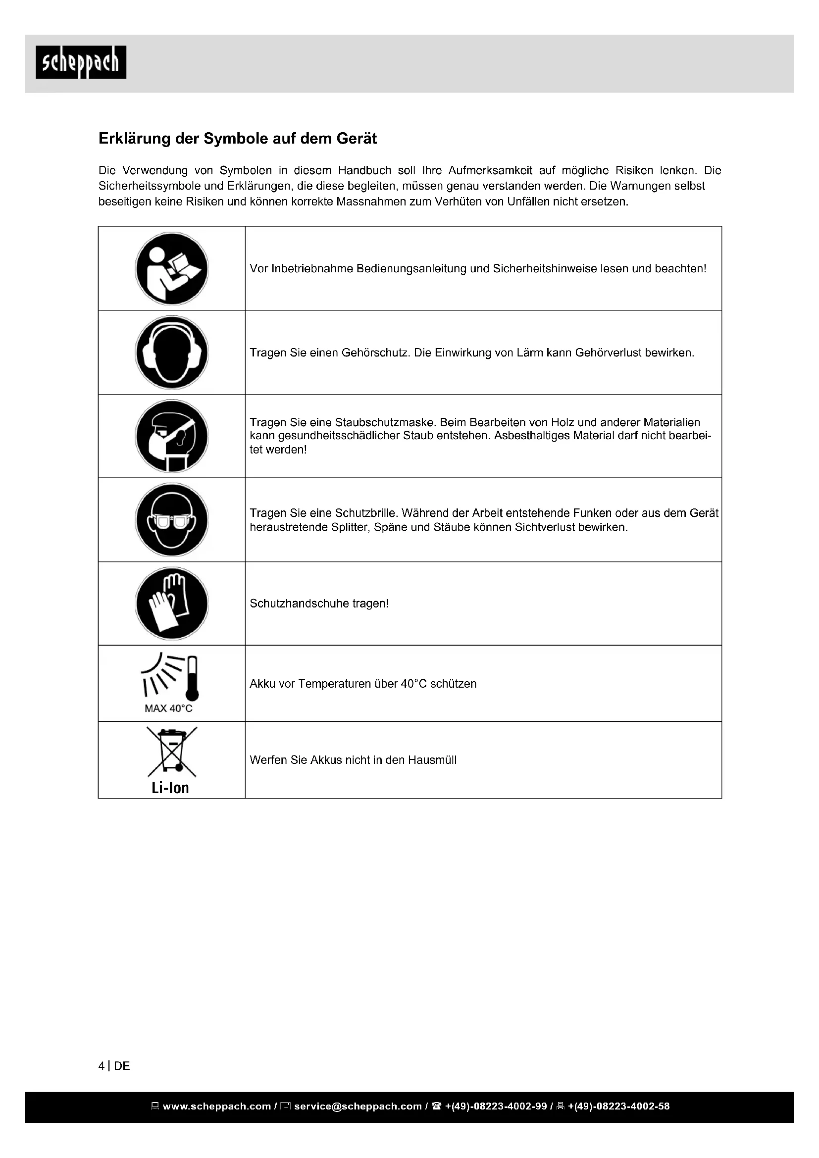 Erklärung der Symbole auf dem Gerät Die Verwendung von Symbolen in diesem Handbuch soll Ihre Aufmerksamkeit auf mögliche Risiken lenken. Die Sicherheitssymbole und Erklärungen, die diese begleiten, müssen genau verstanden werden. Die Warnungen selbst beseitigen keine Risiken und können korrekte Massnahmen zum Verhüten von Unfällen nicht ersetzen. Vor Inbetriebnahme Bedienungsanleitung und Sicherheitshinweise lesen und beachten! Tragen Sie einen Gehörschutz. Die Einwirkung von Lärm kann Gehörverlust bewirken. Tragen Sie eine Staubschutzmaske. Beim Bearbeiten von Holz und anderer Materialien kann gesundheitsschädlicher Staub entstehen. Asbesthaltiges Material darf nicht bearbei- tet werden! Tragen Sie eine Schutzbrille. Während der Arbeit entstehende Funken oder aus dem Gerät heraustretende Splitter, Späne und Stäube können Sichtverlust bewirken. Schutzhandschuhe tragen! Akku vor Temperaturen über 40°C schützen Li-Ion Werfen Sie Akkus nicht in den Hausmüll www.scheppach.com / service@scheppach.com / +(49)-08223-4002-99 / +(49)-08223-4002-58