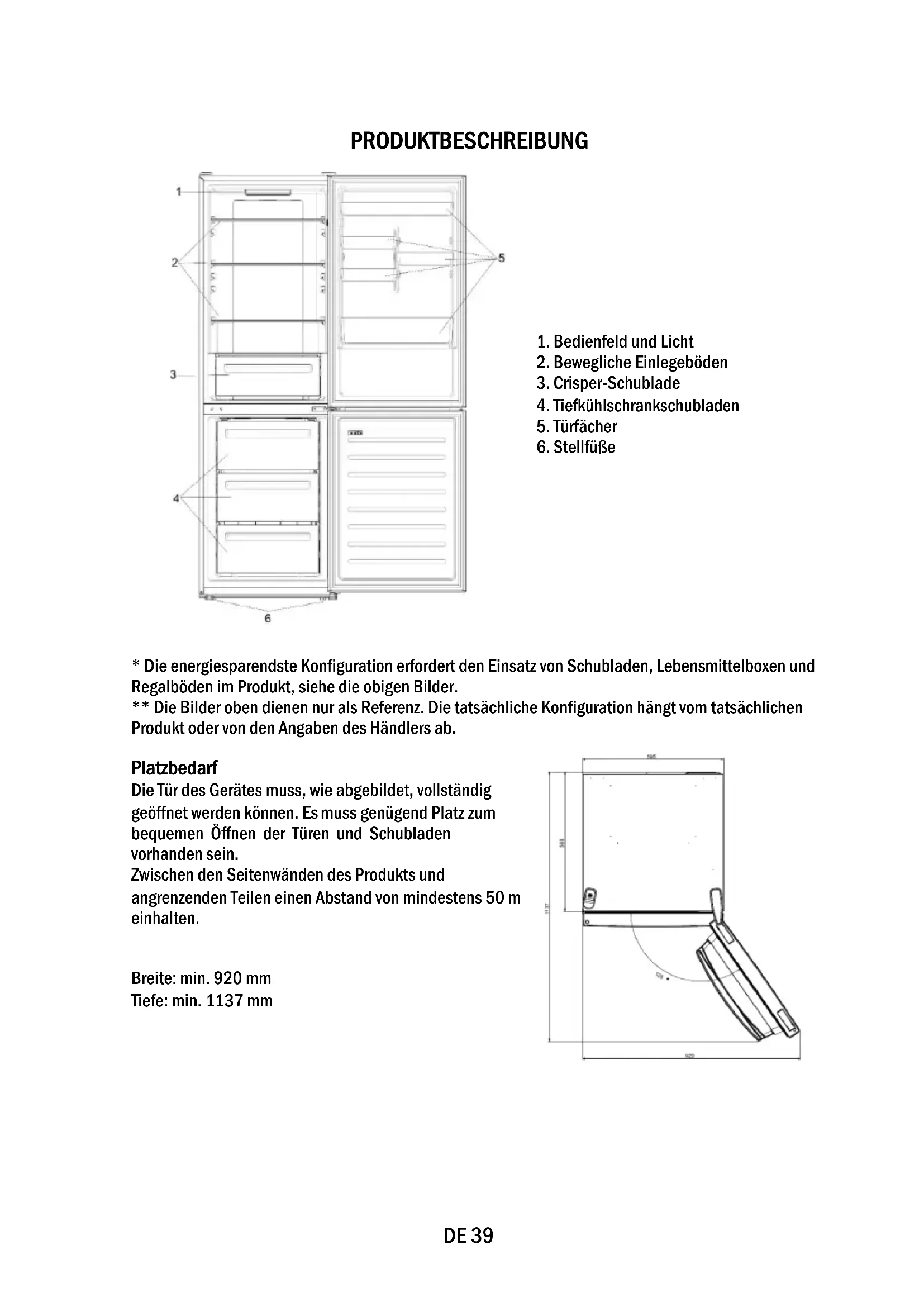 - Die energiesparendste Konfiguration erfordert den Einsatz von Schubladen, Lebensmittelboxen und Regalböden im Produkt, siehe die obigen Bilder. ** Die Bilder oben dienen nur als Referenz. Die tatsächliche Konfiguration hängt vom tatsächlichen Produkt oder von den Angaben des Händlers ab. Platzbedarf Die Tür des Gerätes muss, wie abgebildet, vollständig geöffnet werden können. Es muss genügend Platz zum bequemen Öffnen der Türen und Schubladen vorhanden sein. Zwischen den Seitenwänden des Produkts und angrenzenden Teilen einen Abstand von mindestens 50 mm einhalten. Breite: min. 920 mm Tiefe: min. 1137 mmDE 40 NUTZUNG ➀ Die ON/OFF-Taste dient zum Ein- und Ausschalten des Geräts. ➁ Die Mode-Taste dient zur Auswahl der Kühlschranktemperatur oder der Sonderfunktionen. ➂ Das Wi-Fi-Symbol zeigt an, ob das Gerät mit der App verbunden ist. ➃ Das Super Cool-Symbol zeigt an, ob die Funktion aktiviert ist. ➄ Die Temperaturstufen zeigen die ausgewählte Temperatur an. Nutzung