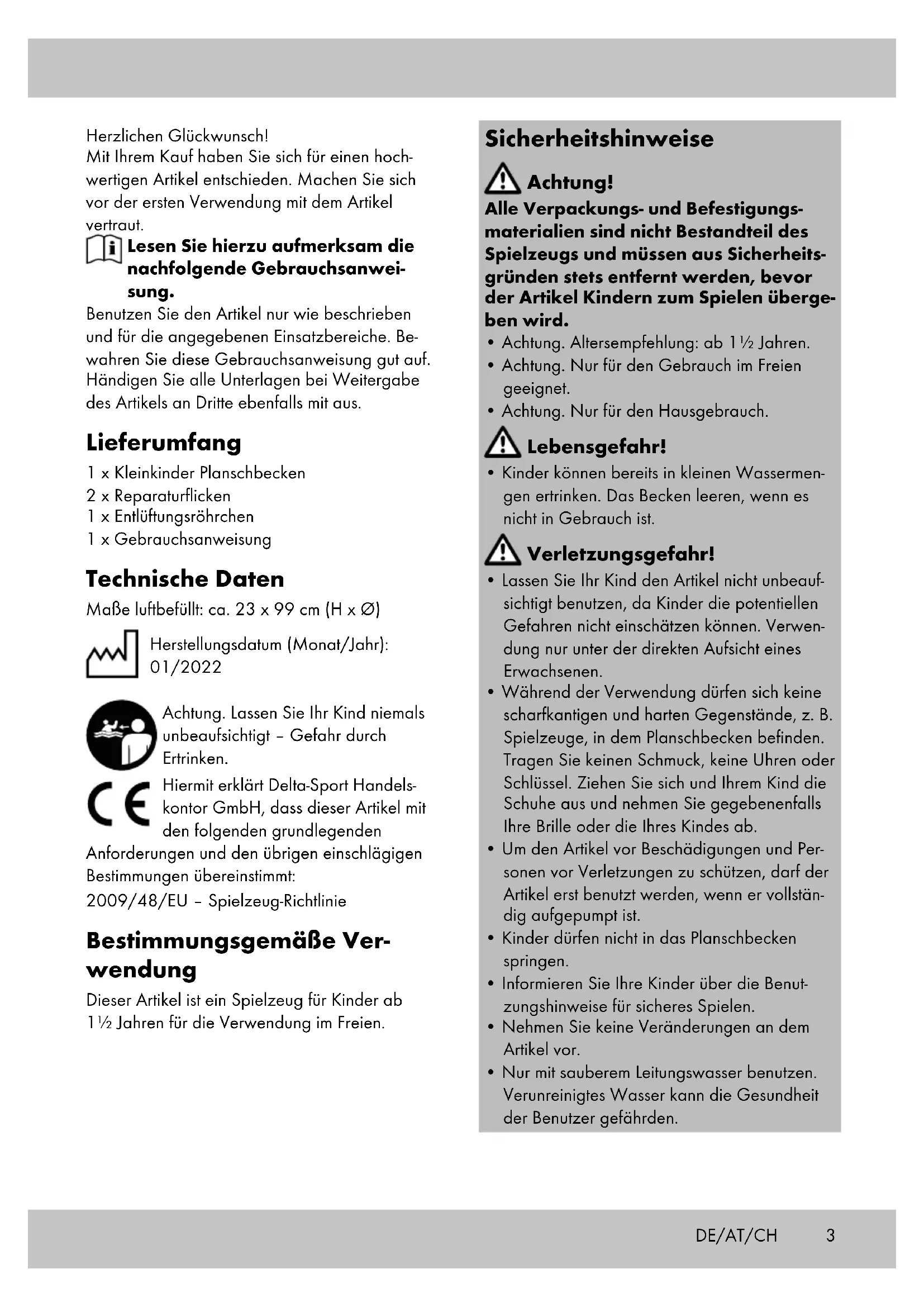 Herzlichen Glückwunsch! Mit Ihrem Kauf haben Sie sich für einen hoch- wertigen Artikel entschieden. Machen Sie sich vor der ersten Verwendung mit dem Artikel vertraut. Lesen Sie hierzu aufmerksam die nachfolgende Gebrauchsanwei- sung. Benutzen Sie den Artikel nur wie beschrieben und für die angegebenen Einsatzbereiche. Be- wahren Sie diese Gebrauchsanweisung gut auf. Händigen Sie alle Unterlagen bei Weitergabe des Artikels an Dritte ebenfalls mit aus. Lieferumfang 1 x Kleinkinder Planschbecken 2 x Reparaturflicken 1 x Entlüftungsröhrchen 1 x Gebrauchsanweisung Technische Daten Maße luftbefüllt: ca. 23 x 99 cm (H x Ø) Herstellungsdatum (Monat/Jahr): 01/2022 Achtung. Lassen Sie Ihr Kind niemals unbeaufsichtigt – Gefahr durch Ertrinken. Hiermit erklärt Delta-Sport Handels- kontor GmbH, dass dieser Artikel mit den folgenden grundlegenden Anforderungen und den übrigen einschlägigen Bestimmungen übereinstimmt: 2009/48/EU – Spielzeug-Richtlinie Bestimmungsgemäße Ver- wendung Dieser Artikel ist ein Spielzeug für Kinder ab 1½ Jahren für die Verwendung im Freien. Sicherheitshinweise Achtung! Alle Verpackungs- und Befestigungs- materialien sind nicht Bestandteil des Spielzeugs und müssen aus Sicherheits- gründen stets entfernt werden, bevor der Artikel Kindern zum Spielen überge- ben wird.