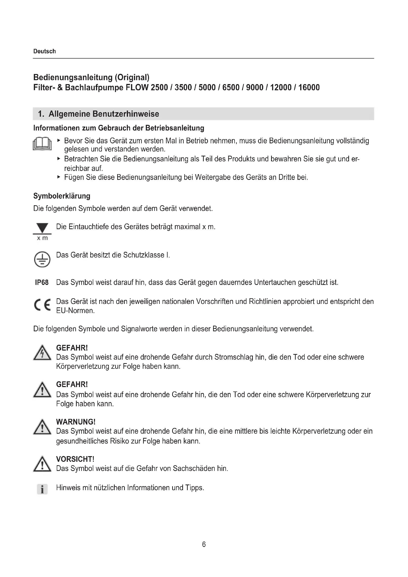 reichbar auf. ▶ Fügen Sie diese Bedienungsanleitung bei Weitergabe des Geräts an Dritte bei. Symbolerklärung Die folgenden Symbole werden auf dem Gerät verwendet. Die Eintauchtiefe des Gerätes beträgt maximal x m. Das Gerät besitzt die Schutzklasse I. Das Symbol weist darauf hin, dass das Gerät gegen dauerndes Untertauchen geschützt ist. Das Gerät ist nach den jeweiligen nationalen Vorschriften und Richtlinien approbiert und entspricht den EU-Normen. Die folgenden Symbole und Signalworte werden in dieser Bedienungsanleitung verwendet. GEFAHR! Das Symbol weist auf eine drohende Gefahr durch Stromschlag hin, die den Tod oder eine schwere Körperverletzung zur Folge haben kann. GEFAHR! Das Symbol weist auf eine drohende Gefahr hin, die den Tod oder eine schwere Körperverletzung zur Folge haben kann. WARNUNG! Das Symbol weist auf eine drohende Gefahr hin, die eine mittlere bis leichte Körperverletzung oder ein gesundheitliches Risiko zur Folge haben kann. VORSICHT! Das Symbol weist auf die Gefahr von Sachschäden hin. Hinweis mit nützlichen Informationen und Tipps. IP687 Deutsch Darstellungskonvention Verweis auf eine Abbildung, hier Verweis auf Abbildung A Sie werden zu einer Handlung aufgefordert.