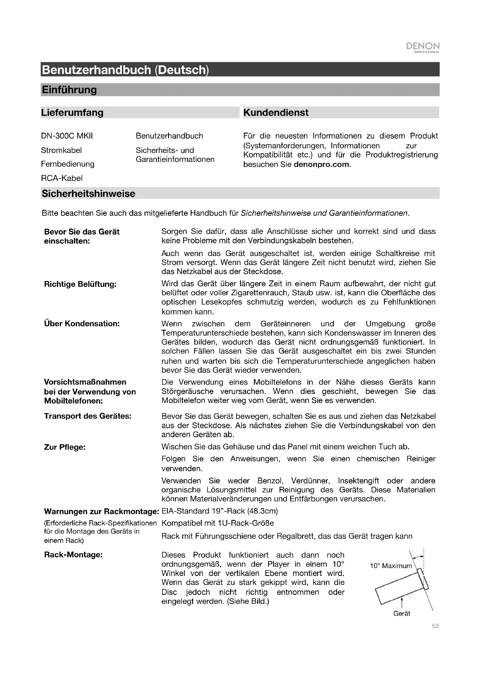 Benutzerhandbuch (Deutsch) Einführung Lieferumfang Kundendienst DN-300C MKII Stromkabel Fernbedienung RCA-Kabel Benutzerhandbuch Sicherheits- und Garantieinformationen Für die neuesten Informationen zu diesem Produkt (Systemanforderungen, Informationen zur Kompatibilität etc.) und für die Produktregistrierung besuchen Sie denonpro.com. Sicherheitshinweise Bitte beachten Sie auch das mitgelieferte Handbuch für Sicherheitshinweise und Garantieinformationen. Bevor Sie das Gerät einschalten: Sorgen Sie dafür, dass alle Anschlüsse sicher und korrekt sind und dass keine Probleme mit den Verbindungskabeln bestehen.