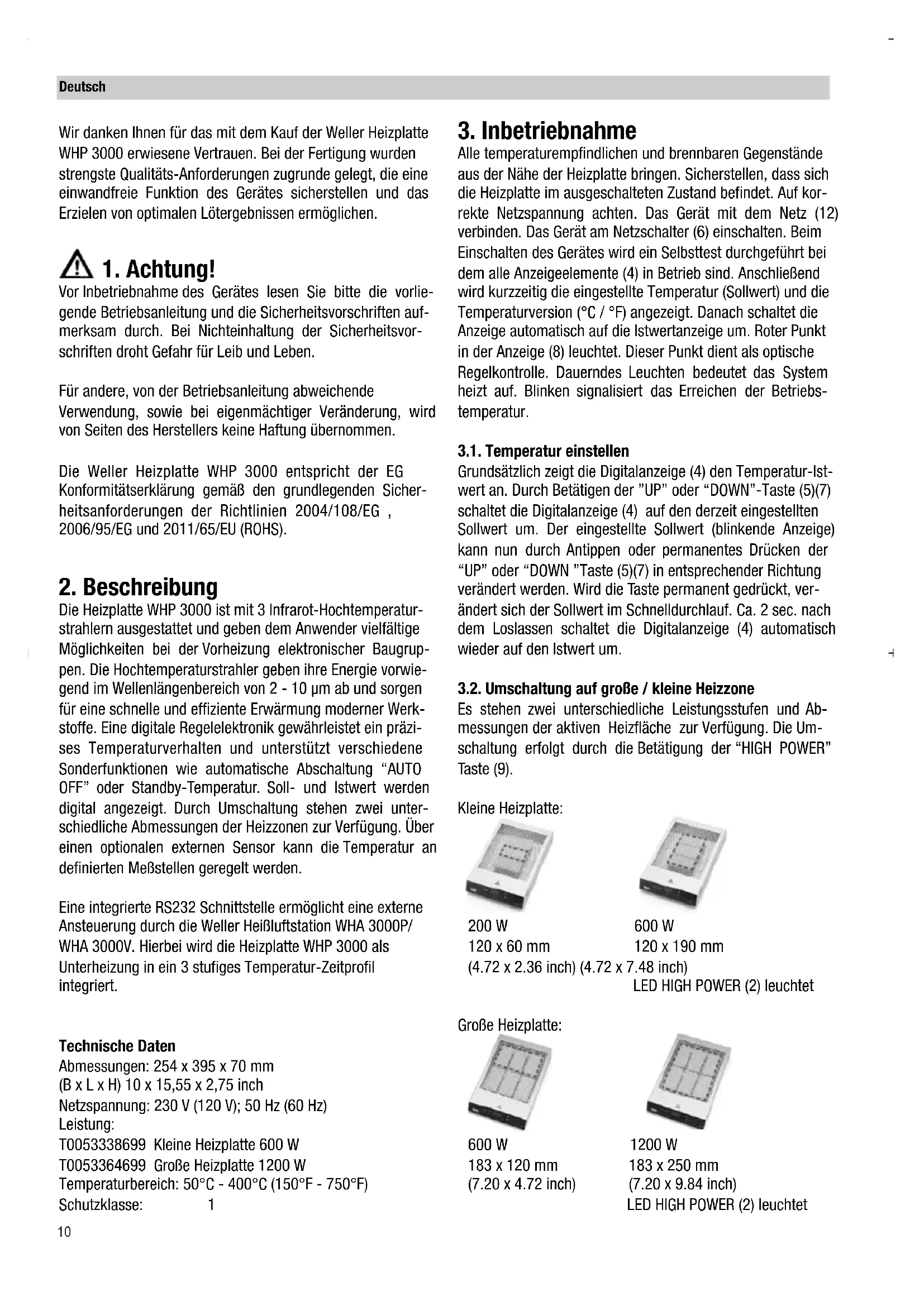 Vor Inbetriebnahme des Gerätes lesen Sie bitte die vorlie- gende Betriebsanleitung und die Sicherheitsvorschriften auf- merksam durch. Bei Nichteinhaltung der Sicherheitsvor- schriften droht Gefahr für Leib und Leben. Für andere, von der Betriebsanleitung abweichende Verwendung, sowie bei eigenmächtiger Veränderung, wird von Seiten des Herstellers keine Haftung übernommen. Die Weller Heizplatte WHP 3000 entspricht der EG Konformitätserklärung gemäß den grundlegenden Sicher- heitsanforderungen der Richtlinien 2004/108/EG , 2006/95/EG und 2011/65/EU (ROHS).