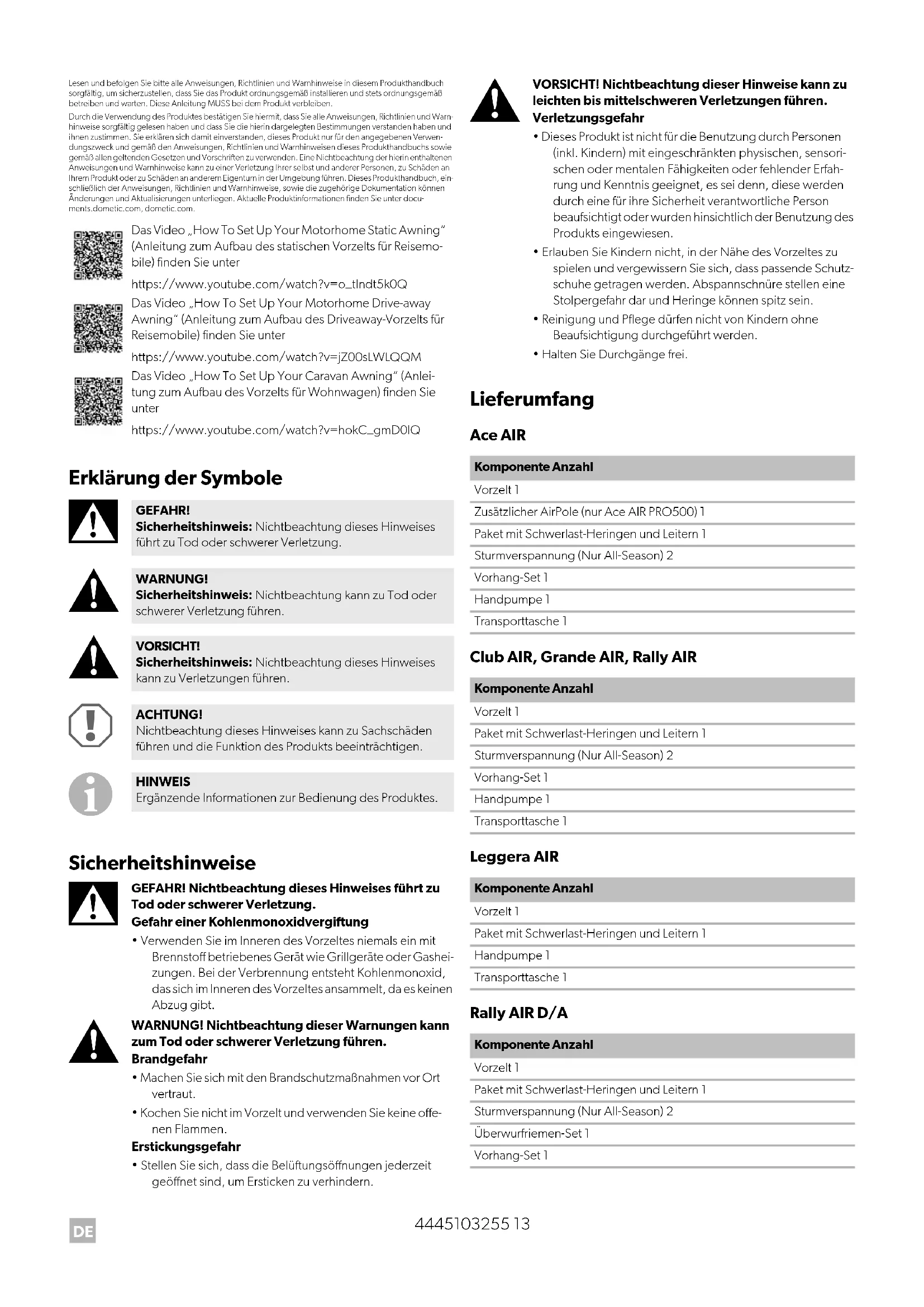 - Halten Sie Durchgänge frei. Lieferumfang Ace AIR Club AIR, Grande AIR, Rally AIR Leggera AIR Rally AIR D/A Das Video „How To Set Up Your Motorhome Static Awning“ (Anleitung zum Aufbau des statischen Vorzelts für Reisemo- bile) finden Sie unter https://www.youtube.com/watch?v=o_tIndt5k0Q Das Video „How To Set Up Your Motorhome Drive-away Awning“ (Anleitung zum Aufbau des Driveaway-Vorzelts für Reisemobile) finden Sie unter https://www.youtube.com/watch?v=jZ00sLWLQQM Das Video „How To Set Up Your Caravan Awning“ (Anlei- tung zum Aufbau des Vorzelts für Wohnwagen) finden Sie unter https://www.youtube.com/watch?v=hokC_gmD0lQ GEFAHR! Sicherheitshinweis: Nichtbeachtung dieses Hinweises führt zu Tod oder schwerer Verletzung. WARNUNG! Sicherheitshinweis: Nichtbeachtung kann zu Tod oder schwerer Verletzung führen. VORSICHT! Sicherheitshinweis: Nichtbeachtung dieses Hinweises kann zu Verletzungen führen. ACHTUNG! Nichtbeachtung dieses Hinweises kann zu Sachschäden führen und die Funktion des Produkts beeinträchtigen. HINWEIS Ergänzende Informationen zur Bedienung des Produktes. Komponente Anzahl Vorzelt 1 Zusätzlicher AirPole (nur Ace AIR PRO500) 1 Paket mit Schwerlast-Heringen und Leitern 1 Sturmverspannung (Nur All-Season) 2 Vorhang-Set 1 Handpumpe 1 Transporttasche 1 Komponente Anzahl Vorzelt 1 Paket mit Schwerlast-Heringen und Leitern 1 Sturmverspannung (Nur All-Season) 2 Vorhang-Set 1 Handpumpe 1 Transporttasche 1 Komponente Anzahl Vorzelt 1 Paket mit Schwerlast-Heringen und Leitern 1 Handpumpe 1 Transporttasche 1 Komponente Anzahl Vorzelt 1 Paket mit Schwerlast-Heringen und Leitern 1 Sturmverspannung (Nur All-Season) 2 Überwurfriemen-Set 1 Vorhang-Set 1DE