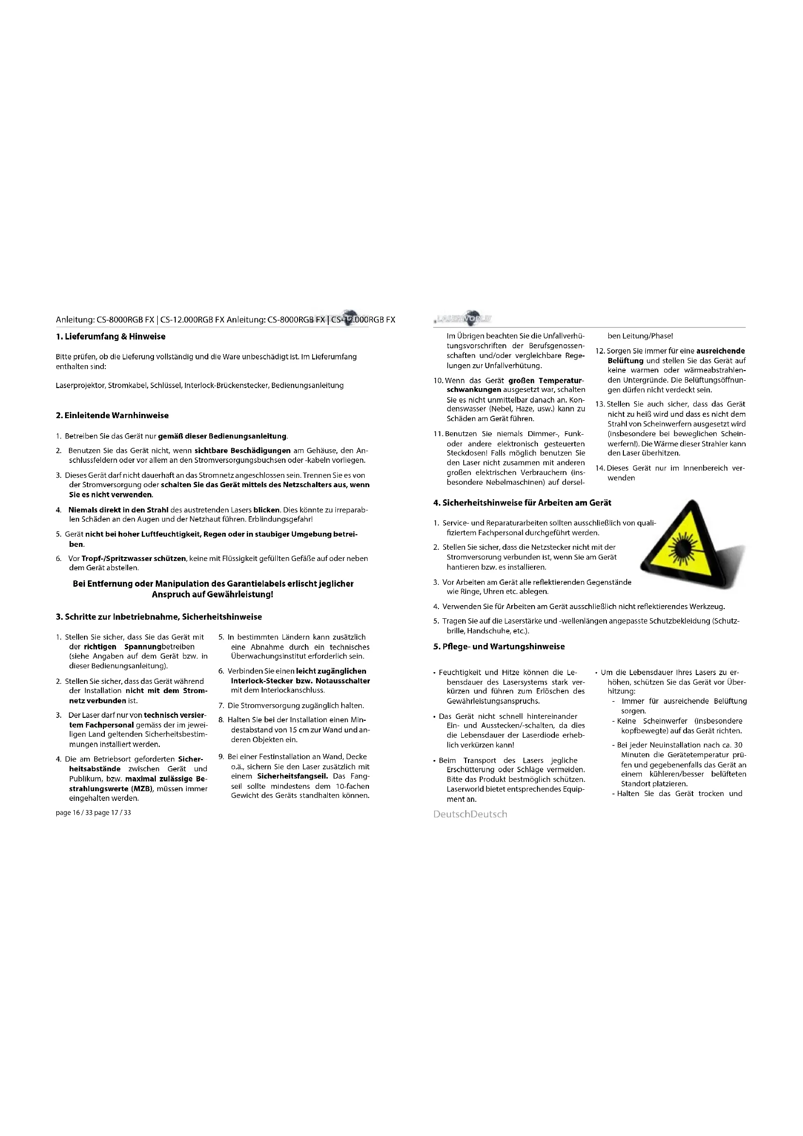 - Um die Lebensdauer Ihres Lasers zu er- höhen, schützen Sie das Gerät vor Über- hitzung: - Immer für ausreichende Belüftung sorgen. - Keine Scheinwerfer (insbesondere kopfbewegte) auf das Gerät richten. - Bei jeder Neuinstallation nach ca. 30 Minuten die Gerätetemperatur prü- fen und gegebenenfalls das Gerät an einem kühleren/besser belüfteten Standort platzieren. - Halten Sie das Gerät trocken undAnleitung: CS-8000RGB FX | CS-12.000RGB FX Anleitung: CS-8000RGB FX | CS-12.000RGB FX page 18 / 33 page 19 / 33 DeutschDeutsch
