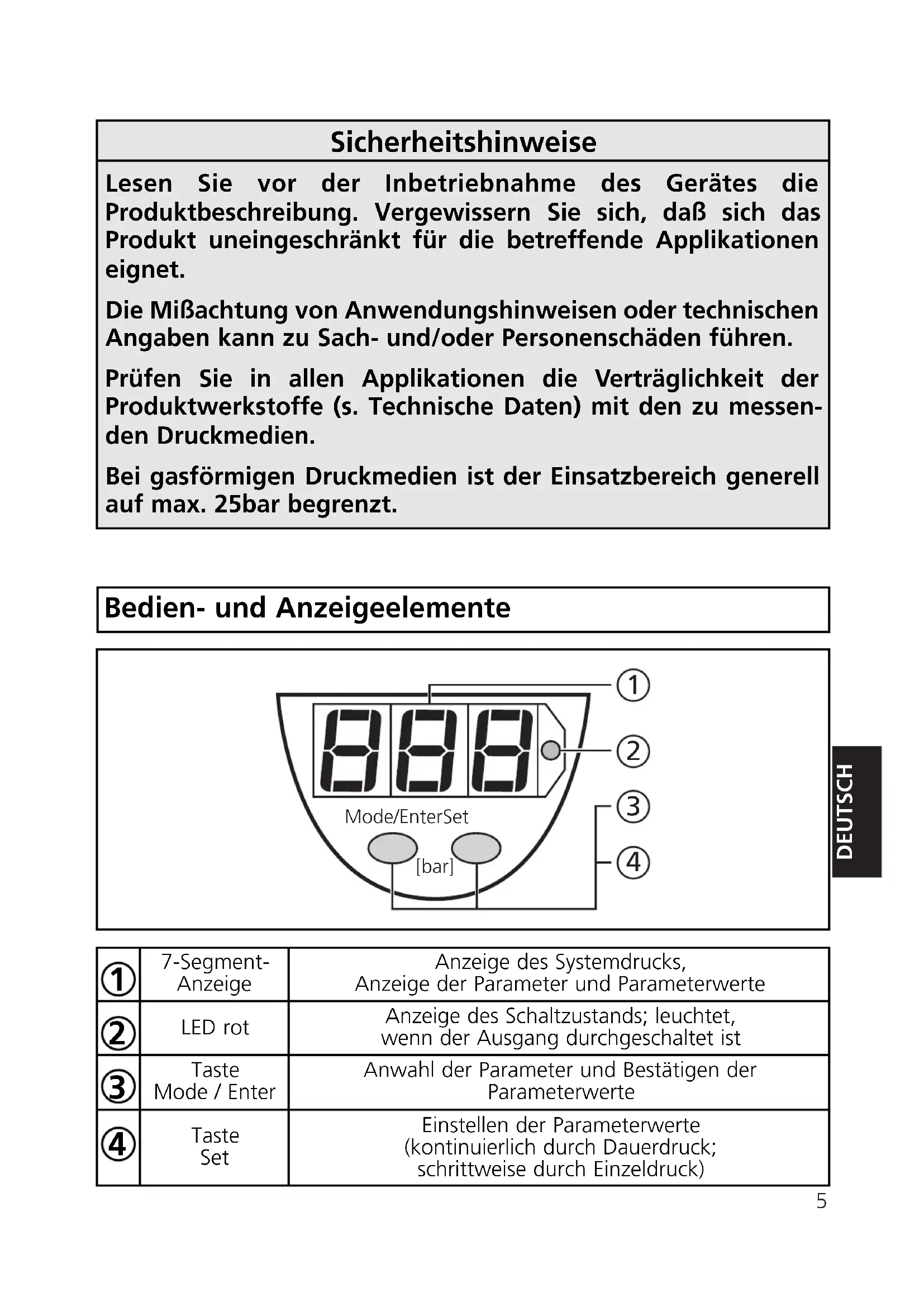 > 5s 1 x Parameter aufrufen Select parameters Sélectionner les paramètres Werte einstellen* Set Values* Régler la valeurs* Werte bestätigen Acknowledgement of values Confirmer la valeur5 DEUTSCH Bedien- und Anzeigeelemente 7-Segment- Anzeige Anzeige des Systemdrucks, Anzeige der Parameter und Parameterwerte LED rot Anzeige des Schaltzustands; leuchtet, wenn der Ausgang durchgeschaltet ist Taste Mode / Enter Anwahl der Parameter und Bestätigen der Parameterwerte Taste Set Einstellen der Parameterwerte (kontinuierlich durch Dauerdruck; schrittweise durch Einzeldruck)