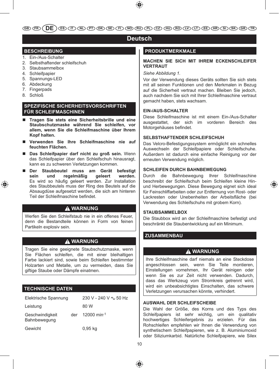 GB DE FR ES IT NL PT DK SE FI NO RU PL Deutsch WARNUNG Entfernen Sie das Schleifpapier oder den Schleifschuh vor der Reinigung stets vom Schuh der Schleifmaschine. Die Missachtung dieser Vorschrift kann zu schweren Körperverletzungen führen.