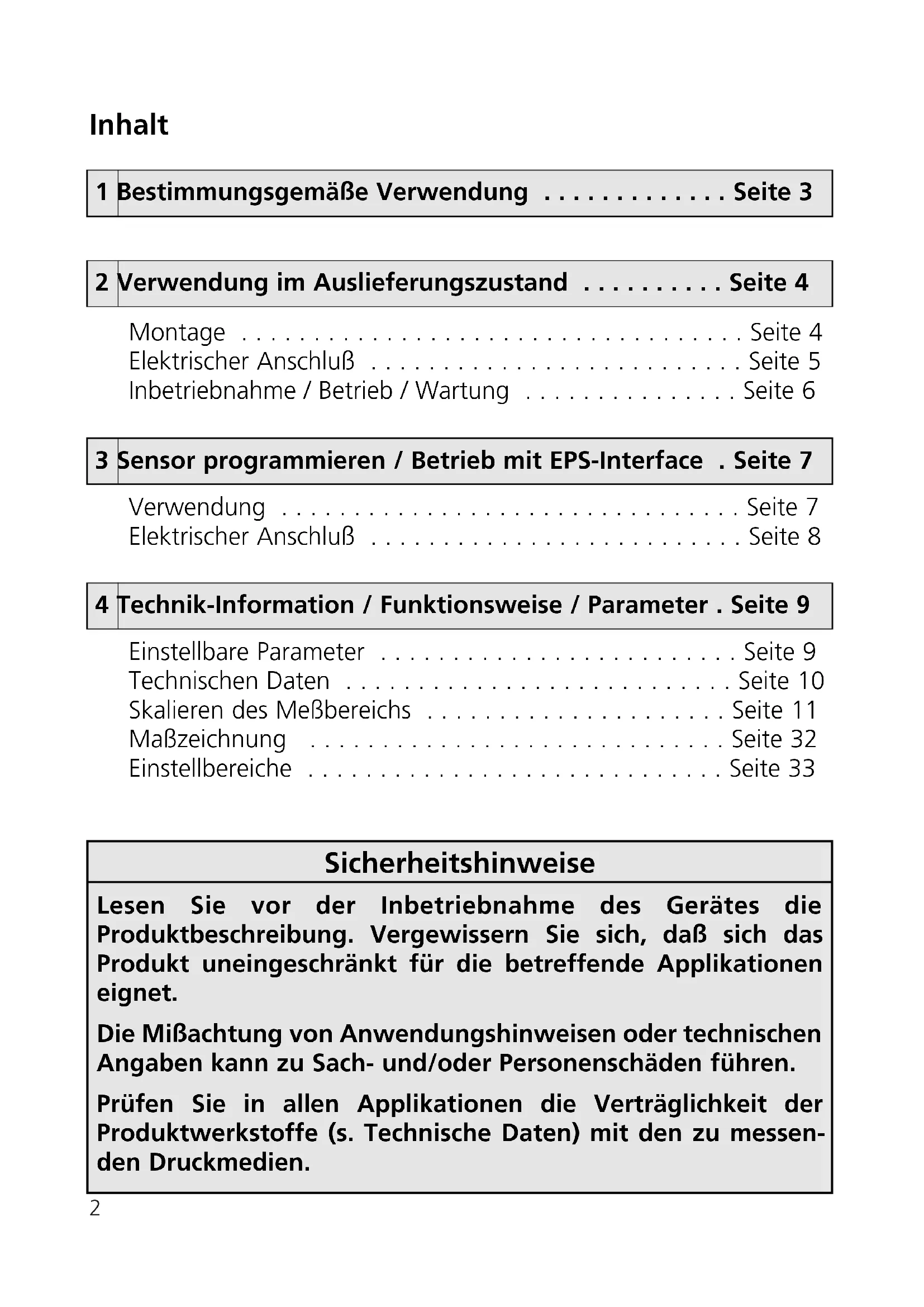 DEUTSCHENGLISHFRANÇAIS Sachnr. 701629/02 03/032 Sicherheitshinweise Lesen Sie vor der Inbetriebnahme des Gerätes die Produktbeschreibung. Vergewissern Sie sich, daß sich das Produkt uneingeschränkt für die betreffende Applikationen eignet. Die Mißachtung von Anwendungshinweisen oder technischen Angaben kann zu Sach- und/oder Personenschäden führen. Prüfen Sie in allen Applikationen die Verträglichkeit der Produktwerkstoffe (s. Technische Daten) mit den zu messen- den Druckmedien. Inhalt Montage . . . . . . . . . . . . . . . . . . . . . . . . . . . . . . . . . . . Seite 4 Elektrischer Anschluß . . . . . . . . . . . . . . . . . . . . . . . . . . Seite 5 Inbetriebnahme / Betrieb / Wartung . . . . . . . . . . . . . . . Seite 6 Verwendung . . . . . . . . . . . . . . . . . . . . . . . . . . . . . . . . Seite 7 Elektrischer Anschluß . . . . . . . . . . . . . . . . . . . . . . . . . . Seite 8 Einstellbare Parameter . . . . . . . . . . . . . . . . . . . . . . . . . Seite 9 Technischen Daten . . . . . . . . . . . . . . . . . . . . . . . . . . . Seite 10 Skalieren des Meßbereichs . . . . . . . . . . . . . . . . . . . . . Seite 11 Maßzeichnung . . . . . . . . . . . . . . . . . . . . . . . . . . . . . Seite 32 Einstellbereiche . . . . . . . . . . . . . . . . . . . . . . . . . . . . . Seite 33 1 Bestimmungsgemäße Verwendung . . . . . . . . . . . . . Seite 3 4 Technik-Information / Funktionsweise / Parameter . Seite 9 3 Sensor programmieren / Betrieb mit EPS-Interface . Seite 7 2 Verwendung im Auslieferungszustand . . . . . . . . . . Seite 4DEUTSCH