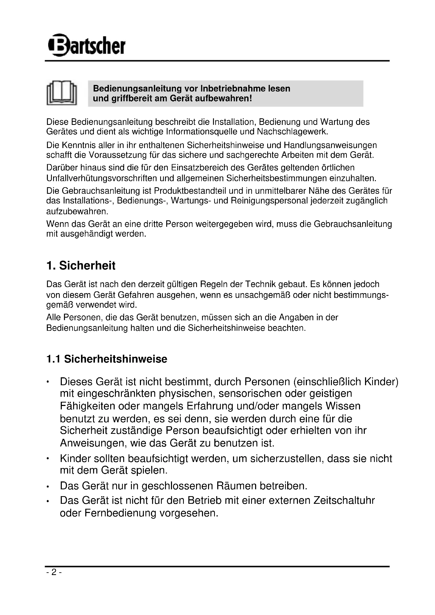 Bartscher GmbH Franz-Kleine-Str. 28 D-33154 Salzkotten Tel.: +49 (0) 5258 971-0 Service-Hotline: 0180 5 971 197 Germany Fax: +49 (0) 5258 971- 120 (14ct/Min. aus dem deutschen Festnetz) D/A/CH- 2 -