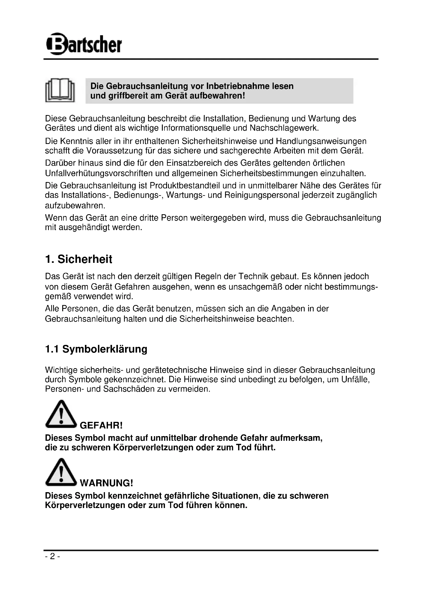 Die Gebrauchsanleitung vor Inbetriebnahme lesen und griffbereit am Gerät aufbewahren!