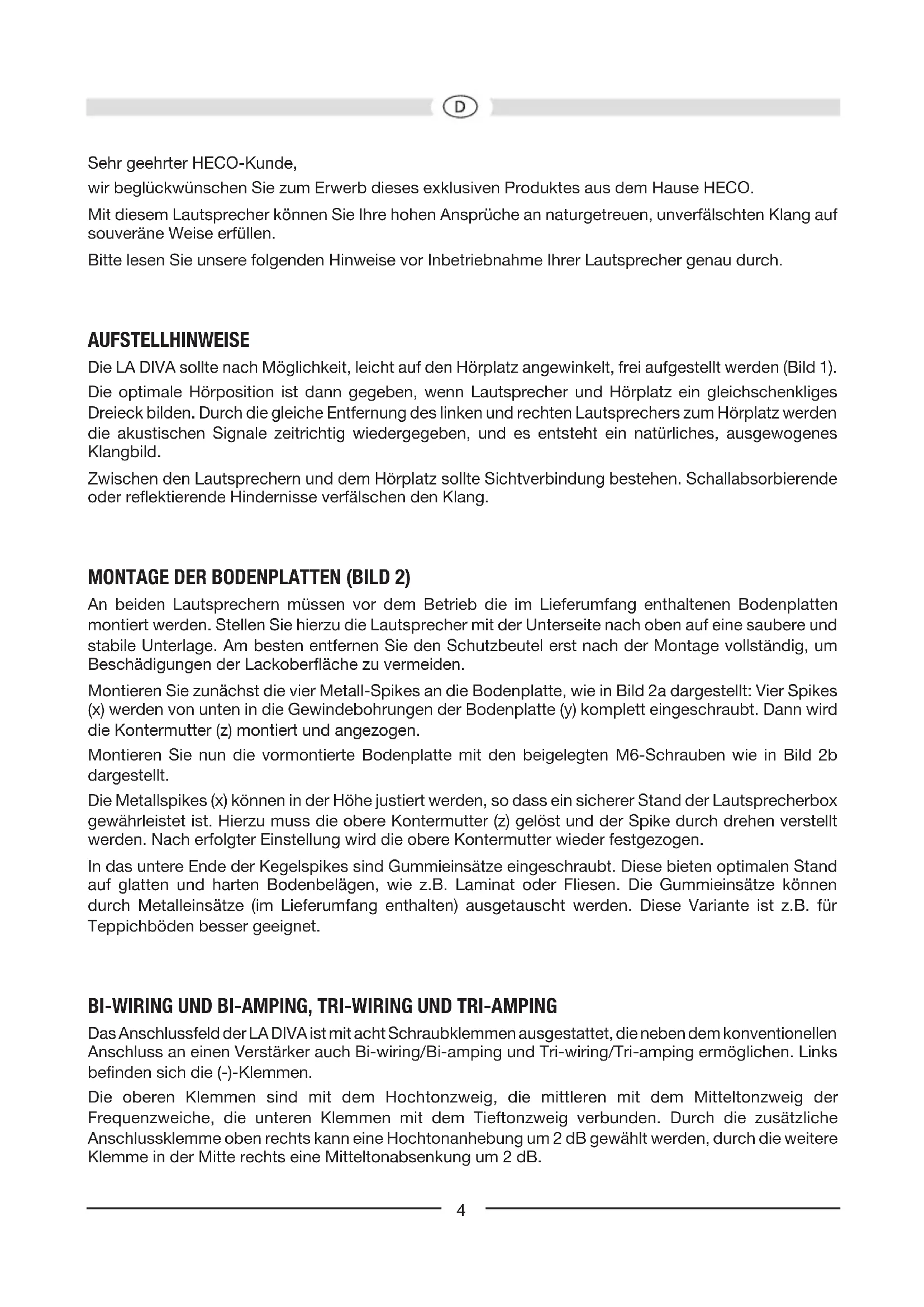 Abbildungen/Illustrations4 Sehr geehrter HECO-Kunde, wir beglückwünschen Sie zum Erwerb dieses exklusiven Produktes aus dem Hause HECO. Mit diesem Lautsprecher können Sie Ihre hohen Ansprüche an naturgetreuen, unverfälschten Klang auf souveräne Weise erfüllen. Bitte lesen Sie unsere folgenden Hinweise vor Inbetriebnahme Ihrer Lautsprecher genau durch. AUFSTELLHINWEISE Die LA DIVA sollte nach Möglichkeit, leicht auf den Hörplatz angewinkelt, frei aufgestellt werden (Bild 1). Die optimale Hörposition ist dann gegeben, wenn Lautsprecher und Hörplatz ein gleichschenkliges Dreieck bilden. Durch die gleiche Entfernung des linken und rechten Lautsprechers zum Hörplatz werden die akustischen Signale zeitrichtig wiedergegeben, und es entsteht ein natürliches, ausgewogenes Klangbild. Zwischen den Lautsprechern und dem Hörplatz sollte Sichtverbindung bestehen. Schallabsorbierende oder reflektierende Hindernisse verfälschen den Klang. MONTAGE DER BODENPLATTEN (BILD 2) An beiden Lautsprechern müssen vor dem Betrieb die im Lieferumfang enthaltenen Bodenplatten montiert werden. Stellen Sie hierzu die Lautsprecher mit der Unterseite nach oben auf eine saubere und stabile Unterlage. Am besten entfernen Sie den Schutzbeutel erst nach der Montage vollständig, um Beschädigungen der Lackoberfläche zu vermeiden. Montieren Sie zunächst die vier Metall-Spikes an die Bodenplatte, wie in Bild 2a dargestellt: Vier Spikes (x) werden von unten in die Gewindebohrungen der Bodenplatte (y) komplett eingeschraubt. Dann wird die Kontermutter (z) montiert und angezogen. Montieren Sie nun die vormontierte Bodenplatte mit den beigelegten M6-Schrauben wie in Bild 2b dargestellt. Die Metallspikes (x) können in der Höhe justiert werden, so dass ein sicherer Stand der Lautsprecherbox gewährleistet ist. Hierzu muss die obere Kontermutter (z) gelöst und der Spike durch drehen verstellt werden. Nach erfolgter Einstellung wird die obere Kontermutter wieder festgezogen. In das untere Ende der Kegelspikes sind Gummieinsätze eingeschraubt. Diese bieten optimalen Stand auf glatten und harten Bodenbelägen, wie z.B. Laminat oder Fliesen. Die Gummieinsätze können durch Metalleinsätze (im Lieferumfang enthalten) ausgetauscht werden. Diese Variante ist z.B. für Teppichböden besser geeignet.