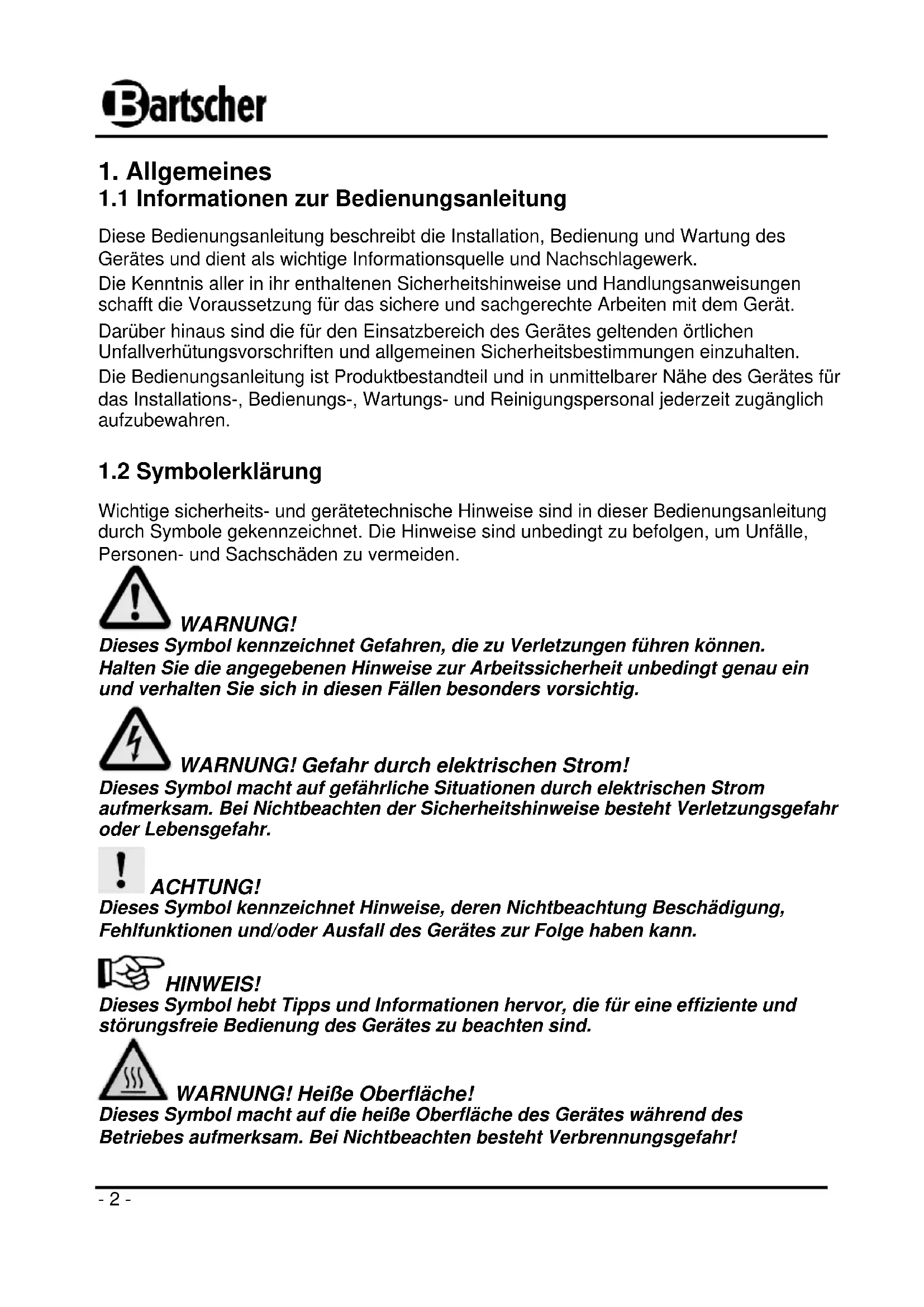 Bartscher GmbH Franz-Kleine-Str. 28 D-33154 Salzkotten Tel.: +49 (0) 5258 971-0 Service-Hotline: 0180 5 971 197 Germany Fax: +49 (0) 5258 971- 120 (14ct/Min. aus dem deutschen Festnetz) D/A/CH- 2 -