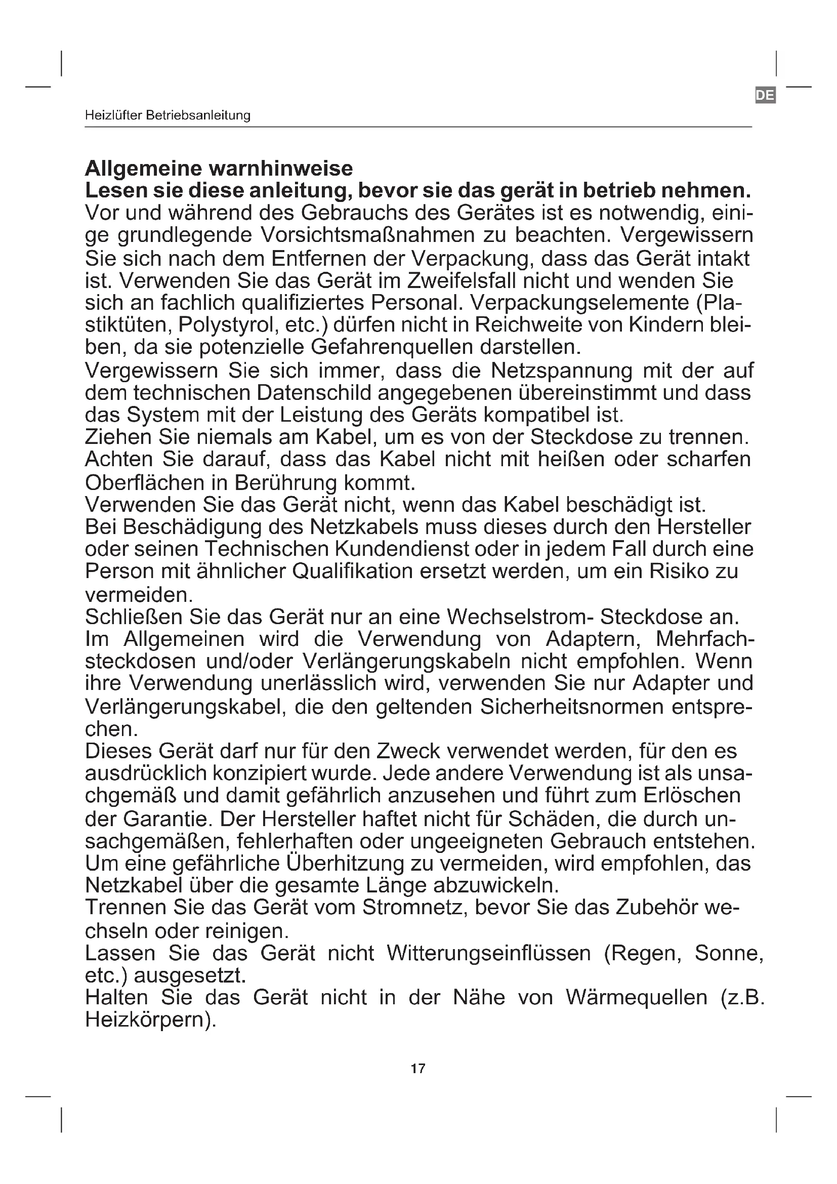 Dieses Gerät darf nicht von Personen (einschließlich Kindern) mit ein- geschränkten körperlichen, sensorischen oder geistigen Fähigkeiten verwendet werden; von Personen, denen die Erfahrung und Kenntnisse über das Gerät fehlen, es sei denn, sie werden von einer für ihre Si- cherheit verantwortlichen Person sorgfältig überwacht oder gut in die Bedienung des Geräts eingewiesen. Achten Sie darauf, dass Kinder nicht mit dem Gerät spielen. Wenn Sie sich entscheiden, dieses Gerät als Abfall zu entsorgen, wird empfohlen, es außer Betrieb zu setzen. Es wird auch empfohlen, teile des gerätes, die eine gefahr darstellen können, sicher zu entsorgen. Dieses gerät darf nicht von kindern benutzt werden. Bewah- ren sie das gerät ausserhalb der reichweite von kin- dern auf. Hinweise Dieses Gerät kann von Kindern ab 8 Jahren und darüber sowie von Personen mit verringerten physischen, sensorischen oder mentalen Fähigkeiten oder Mangel an Erfahrung und Wissen benutzt werden, vo- rausgesetzt, dass sie eine vollständige Einweisung in den sicheren Ge- brauch des Geräts erhalten haben und die damit verbundenen Risiken verstehen. Kinder dürfen nicht mit diesem Gerät spielen. Die Reinigung und Wartung dürfen nicht von Kindern ohne Aufsicht dur- chgeführt werden. Kinder unter 3 Jahren dürfen nicht ohne ständige Aufsicht mit dem Gerät spielen oder sich in dessen Nähe aufhalten. Kinder im Alter von 3 bis 8 Jahren dürfen das Gerät nur dann ein- oder ausschalten, wenn es in seiner normalen Betriebsposition aufgestellt oder installiert ist und Kinder genau beaufsichtigt werden oder vollstän- dige Anweisungen zum sicheren Gebrauch des Geräts erhalten haben und die damit verbundenen Risiken verstehen. Warnung: Einige Teile des Geräts können während des Gebrau- chs sehr heiß werden, besondere Vorsicht ist in Gegenwart von Kindern und gefährdeten Personen geboten.Heizlüfter Betriebsanleitung