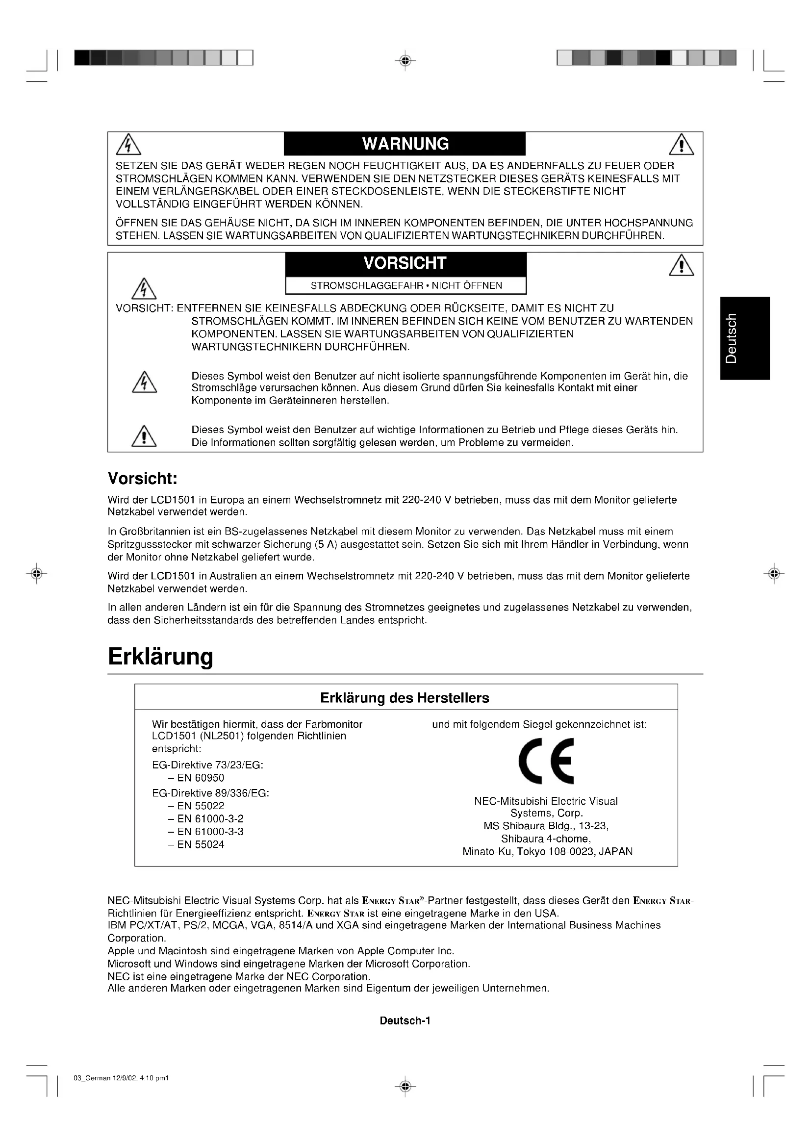 -Partner festgestellt, dass dieses Gerät den ENERGY STAR- Richtlinien für Energieeffizienz entspricht. ENERGY STAR ist eine eingetragene Marke in den USA. IBM PC/XT/AT, PS/2, MCGA, VGA, 8514/A und XGA sind eingetragene Marken der International Business Machines Corporation. Apple und Macintosh sind eingetragene Marken von Apple Computer Inc. Microsoft und Windows sind eingetragene Marken der Microsoft Corporation. NEC ist eine eingetragene Marke der NEC Corporation. Alle anderen Marken oder eingetragenen Marken sind Eigentum der jeweiligen Unternehmen. Wir bestätigen hiermit, dass der Farbmonitor LCD1501 (NL2501) folgenden Richtlinien entspricht: EG-Direktive 73/23/EG: – EN 60950 EG-Direktive 89/336/EG: – EN 55022 – EN 61000-3-2 – EN 61000-3-3 – EN 55024 und mit folgendem Siegel gekennzeichnet ist: NEC-Mitsubishi Electric Visual Systems, Corp. MS Shibaura Bldg., 13-23, Shibaura 4-chome, Minato-Ku, Tokyo 108-0023, JAPAN Vorsicht: Wird der LCD1501 in Europa an einem Wechselstromnetz mit 220-240 V betrieben, muss das mit dem Monitor gelieferte Netzkabel verwendet werden. In Großbritannien ist ein BS-zugelassenes Netzkabel mit diesem Monitor zu verwenden. Das Netzkabel muss mit einem Spritzgussstecker mit schwarzer Sicherung (5 A) ausgestattet sein. Setzen Sie sich mit Ihrem Händler in Verbindung, wenn der Monitor ohne Netzkabel geliefert wurde. Wird der LCD1501 in Australien an einem Wechselstromnetz mit 220-240 V betrieben, muss das mit dem Monitor gelieferte Netzkabel verwendet werden. In allen anderen Ländern ist ein für die Spannung des Stromnetzes geeignetes und zugelassenes Netzkabel zu verwenden, dass den Sicherheitsstandards des betreffenden Landes entspricht. SETZEN SIE DAS GERÄT WEDER REGEN NOCH FEUCHTIGKEIT AUS, DA ES ANDERNFALLS ZU FEUER ODER STROMSCHLÄGEN KOMMEN KANN. VERWENDEN SIE DEN NETZSTECKER DIESES GERÄTS KEINESFALLS MIT EINEM VERLÄNGERSKABEL ODER EINER STECKDOSENLEISTE, WENN DIE STECKERSTIFTE NICHT VOLLSTÄNDIG EINGEFÜHRT WERDEN KÖNNEN. ÖFFNEN SIE DAS GEHÄUSE NICHT, DA SICH IM INNEREN KOMPONENTEN BEFINDEN, DIE UNTER HOCHSPANNUNG STEHEN. LASSEN SIE WARTUNGSARBEITEN VON QUALIFIZIERTEN WARTUNGSTECHNIKERN DURCHFÜHREN. WARNUNG VORSICHT VORSICHT: ENTFERNEN SIE KEINESFALLS ABDECKUNG ODER RÜCKSEITE, DAMIT ES NICHT ZU STROMSCHLÄGEN KOMMT. IM INNEREN BEFINDEN SICH KEINE VOM BENUTZER ZU WARTENDEN