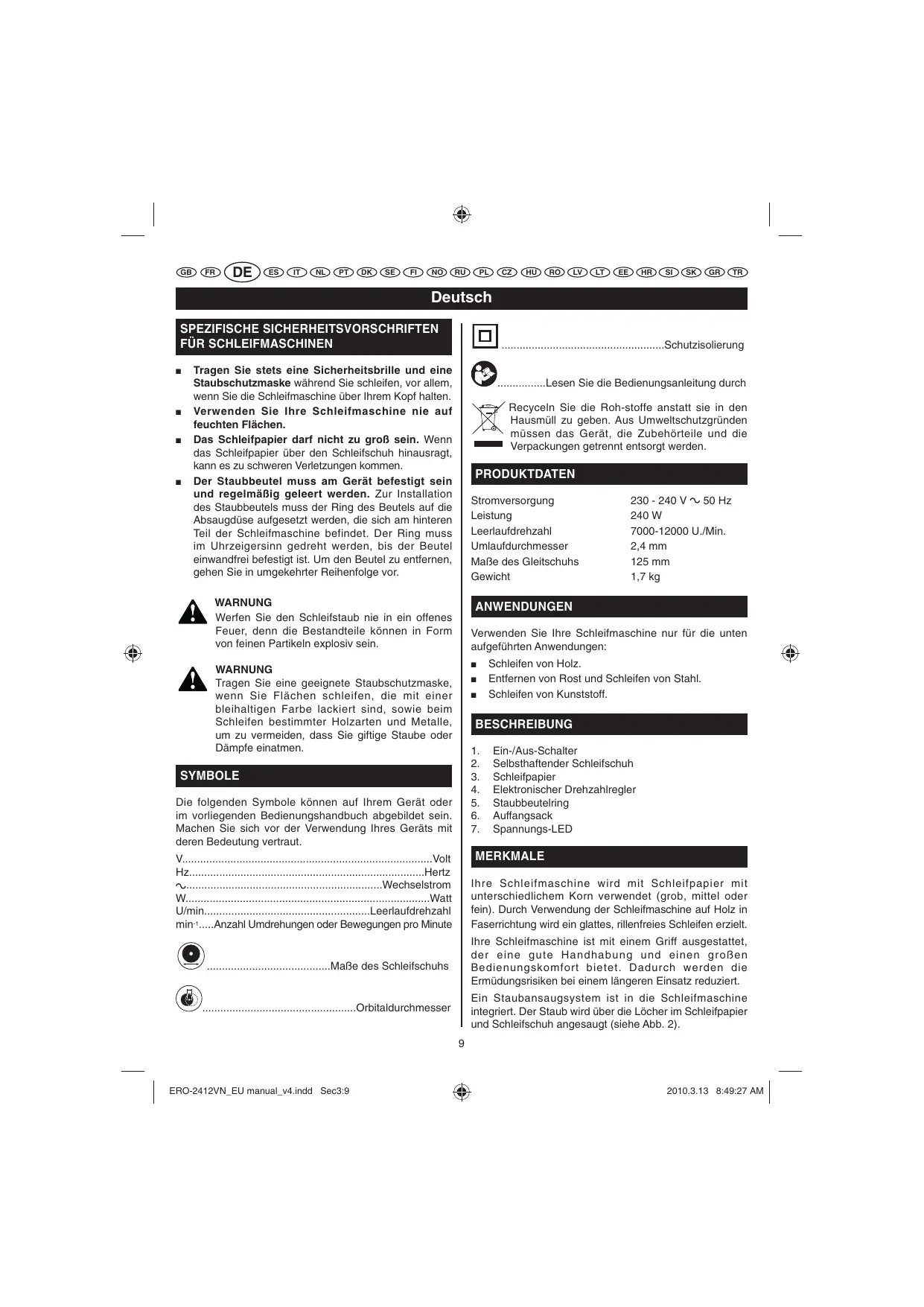 ......................................................Schutzisolierung Tragen Sie stets eine Sicherheitsbrille und eine Staubschutzmaske während Sie schleifen, vor allem, wenn Sie die Schleifmaschine über Ihrem Kopf halten. Verwenden Sie Ihre Schleifmaschine nie auf feuchten Flächen. Das Schleifpapier darf nicht zu groß sein. Wenn das Schleifpapier über den Schleifschuh hinausragt, kann es zu schweren Verletzungen kommen. Der Staubbeutel muss am Gerät befestigt sein und regelmäßig geleert werden. Zur Installation des Staubbeutels muss der Ring des Beutels auf die Absaugdüse aufgesetzt werden, die sich am hinteren Teil der Schleifmaschine befindet. Der Ring muss im Uhrzeigersinn gedreht werden, bis der Beutel einwandfrei befestigt ist. Um den Beutel zu entfernen, gehen Sie in umgekehrter Reihenfolge vor. ................Lesen Sie die Bedienungsanleitung durch Recyceln Sie die Roh-stoffe anstatt sie in den Hausmüll zu geben. Aus Umweltschutzgründen müssen das Gerät, die Zubehörteile und die Verpackungen getrennt entsorgt werden. PRODUKTDATEN Stromversorgung Leistung Leerlaufdrehzahl Umlaufdurchmesser Maße des Gleitschuhs Gewicht WARNUNG Werfen Sie den Schleifstaub nie in ein offenes Feuer, denn die Bestandteile können in Form von feinen Partikeln explosiv sein.