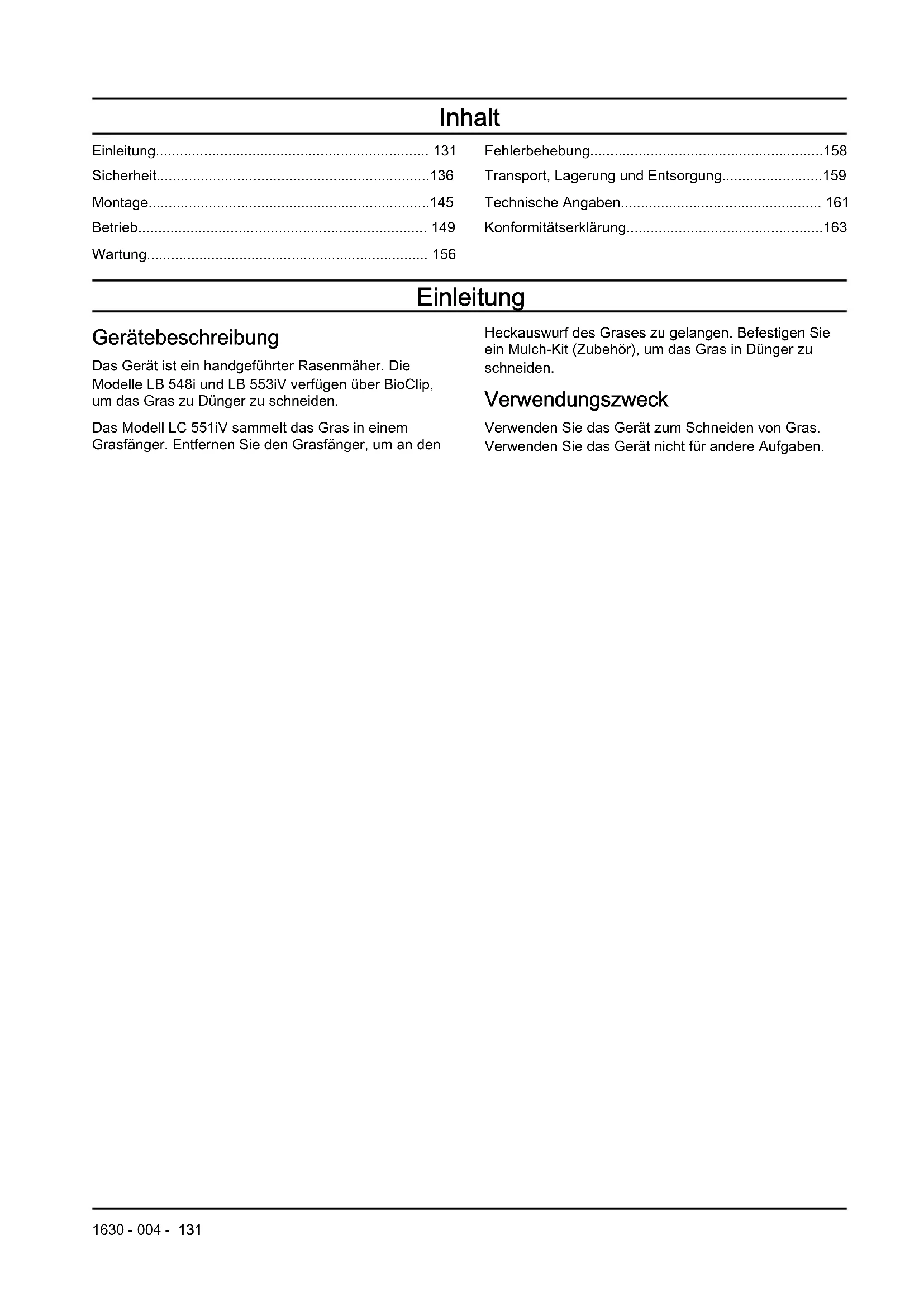 - Konformitätserklärung Einleitung Gerätebeschreibung Das Gerät ist ein handgeführter Rasenmäher. Die Modelle LB 548i und LB553iV verfügen über BioClip, um das Gras zu Dünger zu schneiden. Das Modell LC551iV sammelt das Gras in einem Grasfänger. Entfernen Sie den Grasfänger, um an den Heckauswurf des Grases zu gelangen. Befestigen Sie ein Mulch-Kit (Zubehör), um das Gras in Dünger zu schneiden. Verwendungszweck Verwenden Sie das Gerät zum Schneiden von Gras. Verwenden Sie das Gerät nicht für andere Aufgaben. 1630 - 004 - 131Geräteübersicht (LB548i, LC551iV) LB 548i LC 551iV p. 163