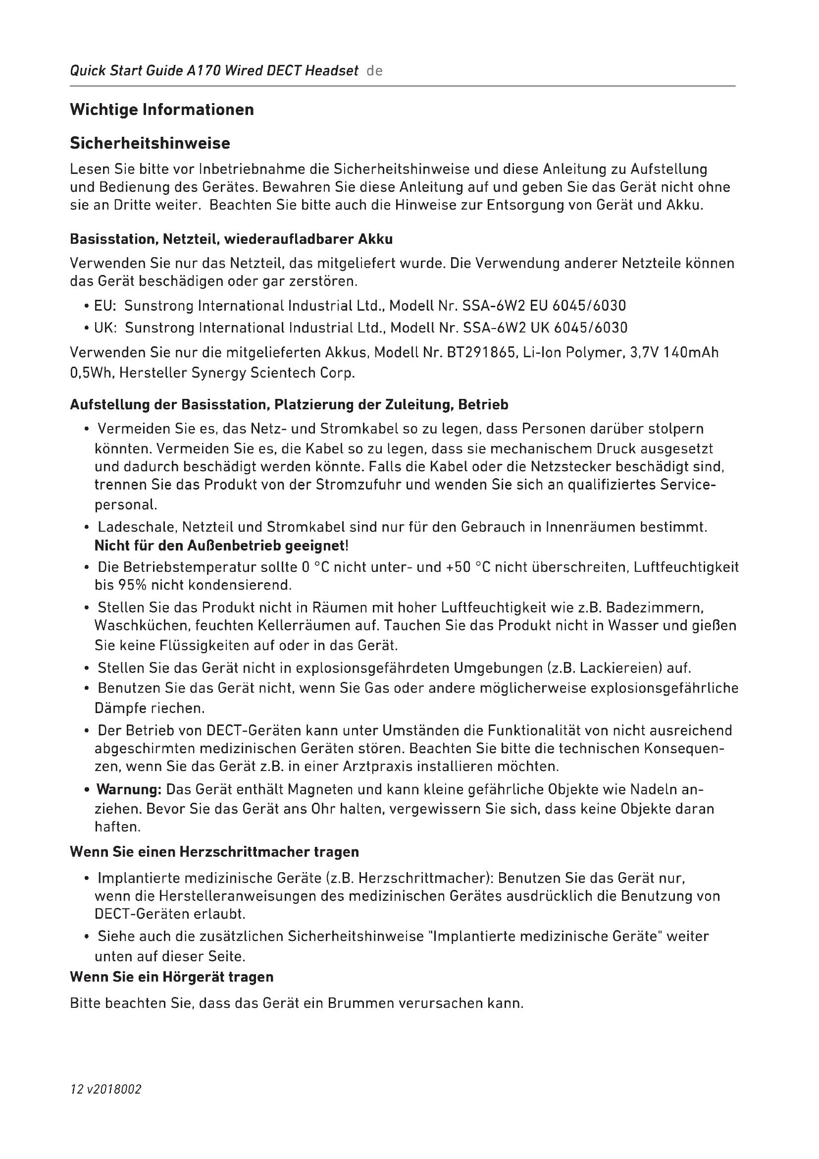 Verwenden Sie nur die mitgelieferten Akkus, Modell Nr. BT291865, Li-Ion Polymer, 3,7V 140mAh 0,5Wh, Hersteller Synergy Scientech Corp.