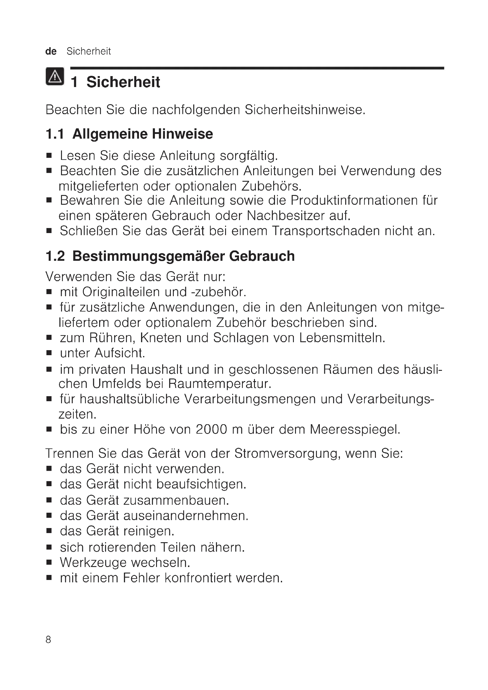 1 Sicherheit Beachten Sie die nachfolgenden Sicherheitshinweise. 1.1 Allgemeine Hinweise ¡ Lesen Sie diese Anleitung sorgfältig. ¡ Beachten Sie die zusätzlichen Anleitungen bei Verwendung des mitgelieferten oder optionalen Zubehörs. ¡ Bewahren Sie die Anleitung sowie die Produktinformationen für einen späteren Gebrauch oder Nachbesitzer auf. ¡ Schließen Sie das Gerät bei einem Transportschaden nicht an. 1.2 Bestimmungsgemäßer Gebrauch Verwenden Sie das Gerät nur: ¡ mit Originalteilen und -zubehör. ¡ für zusätzliche Anwendungen, die in den Anleitungen von mitge- liefertem oder optionalem Zubehör beschrieben sind. ¡ zum Rühren, Kneten und Schlagen von Lebensmitteln. ¡ unter Aufsicht. ¡ im privaten Haushalt und in geschlossenen Räumen des häusli- chen Umfelds bei Raumtemperatur. ¡ für haushaltsübliche Verarbeitungsmengen und Verarbeitungs- zeiten. ¡ bis zu einer Höhe von 2000m über dem Meeresspiegel. Trennen Sie das Gerät von der Stromversorgung, wenn Sie: ¡ das Gerät nicht verwenden. ¡ das Gerät nicht beaufsichtigen. ¡ das Gerät zusammenbauen. ¡ das Gerät auseinandernehmen. ¡ das Gerät reinigen. ¡ sich rotierenden Teilen nähern. ¡ Werkzeuge wechseln. ¡ mit einem Fehler konfrontiert werden.Sicherheit de