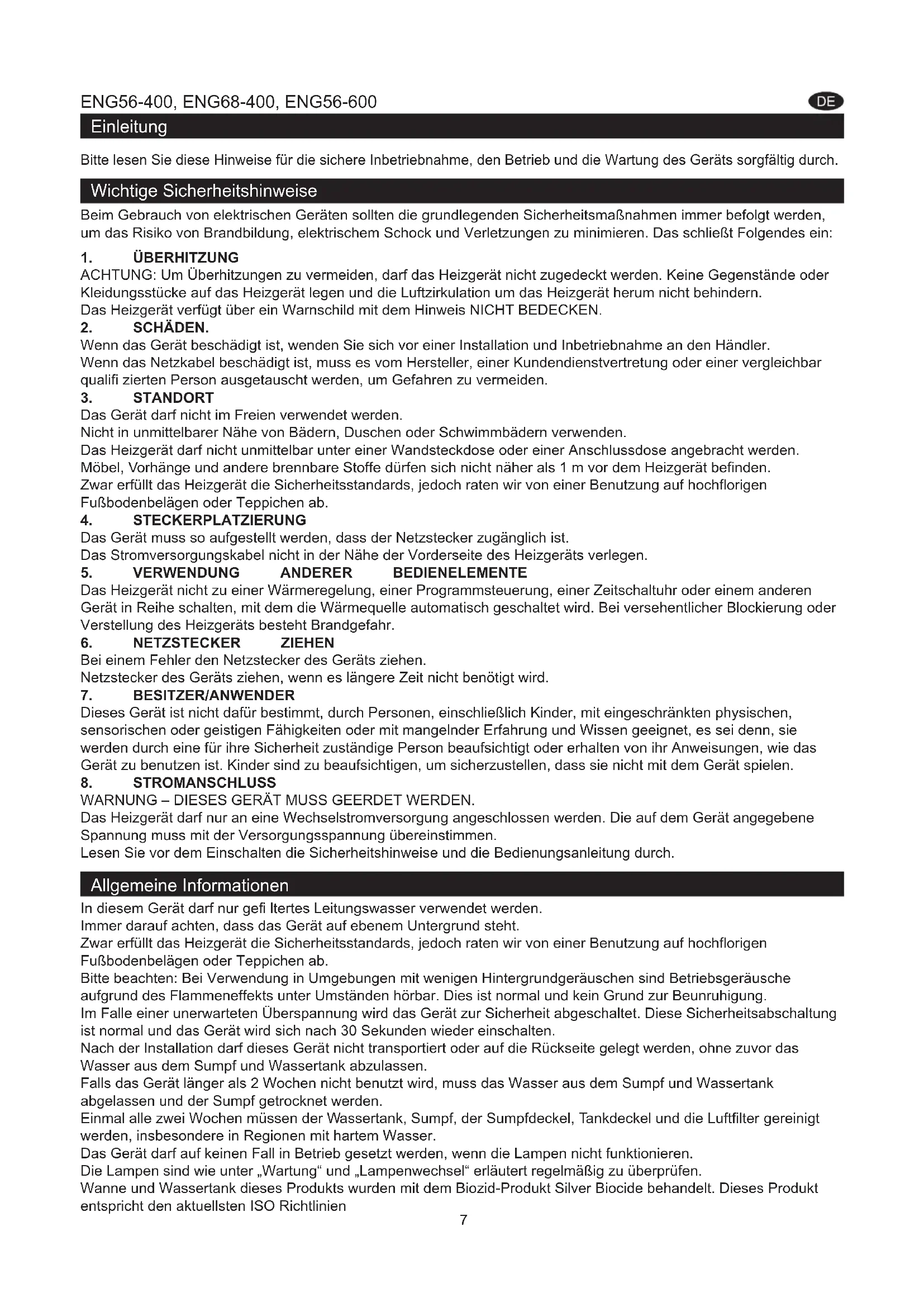 WARNUNG – DIESES GERÄT MUSS GEERDET WERDEN. Das Heizgerät darf nur an eine Wechselstromversorgung angeschlossen werden. Die auf dem Gerät angegebene Spannung muss mit der Versorgungsspannung übereinstimmen. Lesen Sie vor dem Einschalten die Sicherheitshinweise und die Bedienungsanleitung durch. Allgemeine Informationen In diesem Gerät darf nur gefi ltertes Leitungswasser verwendet werden. Immer darauf achten, dass das Gerät auf ebenem Untergrund steht. Zwar erfüllt das Heizgerät die Sicherheitsstandards, jedoch raten wir von einer Benutzung auf hochfl origen Fußbodenbelägen oder Teppichen ab. Bitte beachten: Bei Verwendung in Umgebungen mit wenigen Hintergrundgeräuschen sind Betriebsgeräusche aufgrund des Flammeneffekts unter Umständen hörbar. Dies ist normal und kein Grund zur Beunruhigung. Im Falle einer unerwarteten Überspannung wird das Gerät zur Sicherheit abgeschaltet. Diese Sicherheitsabschaltung ist normal und das Gerät wird sich nach 30 Sekunden wieder einschalten. Nach der Installation darf dieses Gerät nicht transportiert oder auf die Rückseite gelegt werden, ohne zuvor das Wasser aus dem Sumpf und Wassertank abzulassen. Falls das Gerät länger als 2 Wochen nicht benutzt wird, muss das Wasser aus dem Sumpf und Wassertank abgelassen und der Sumpf getrocknet werden. Einmal alle zwei Wochen müssen der Wassertank, Sumpf, der Sumpfdeckel, Tankdeckel und die Luftfi lter gereinigt werden, insbesondere in Regionen mit hartem Wasser. Das Gerät darf auf keinen Fall in Betrieb gesetzt werden, wenn die Lampen nicht funktionieren. Die Lampen sind wie unter „Wartung“ und „Lampenwechsel“ erläutert regelmäßig zu überprüfen. Wanne und Wassertank dieses Produkts wurden mit dem Biozid-Produkt Silver Biocide behandelt. Dieses Produkt entspricht den aktuellsten ISO Richtlinien 7Installationsanleitung Dieser Abschnitt erläutert die Einstellung des Elektrokamins. VOR INBETRIEBNAHME