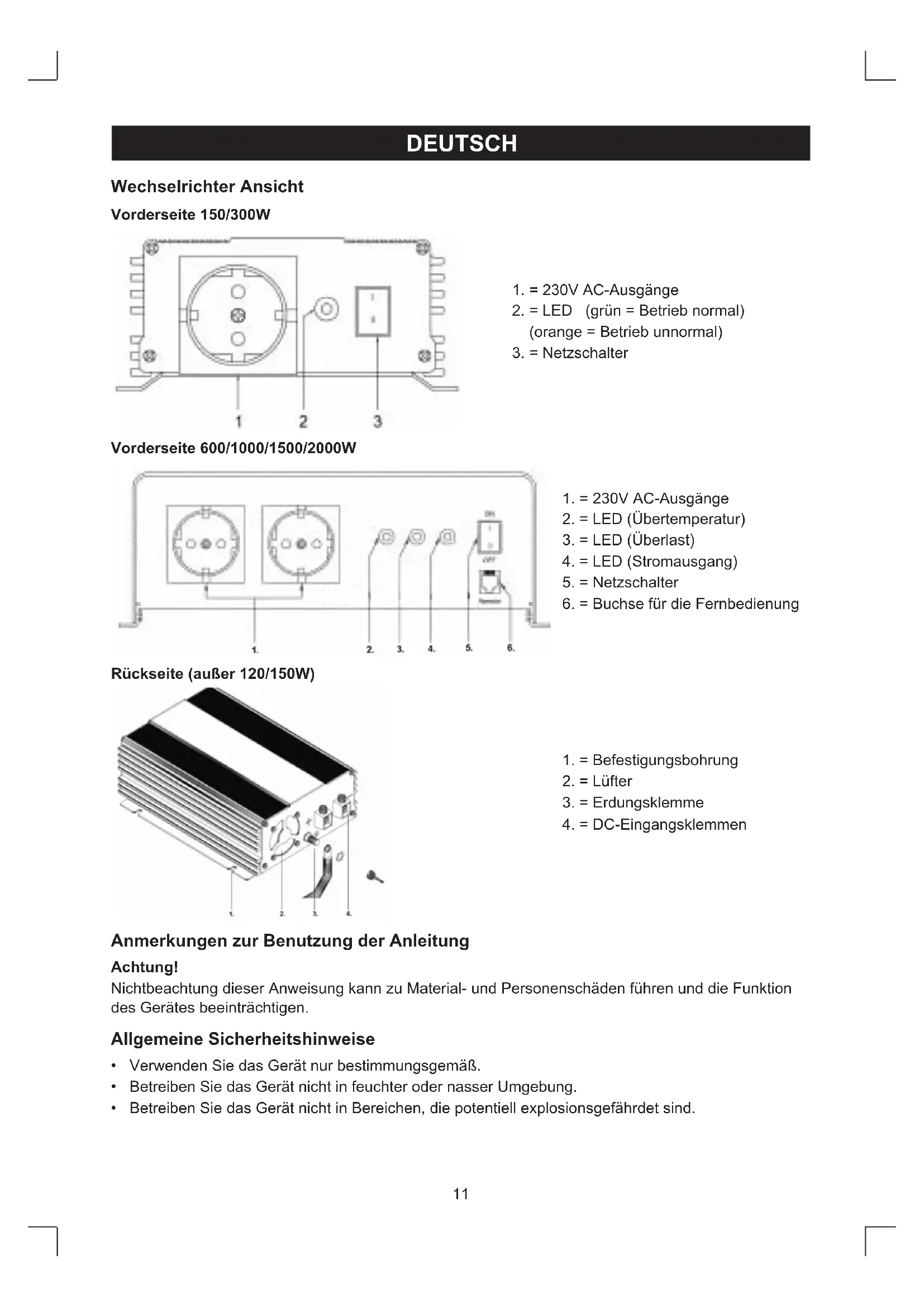 CAUTION11 DEUTSCH Wechselrichter Ansicht Vorderseite 150/300W 1.=230VAC-Ausgänge