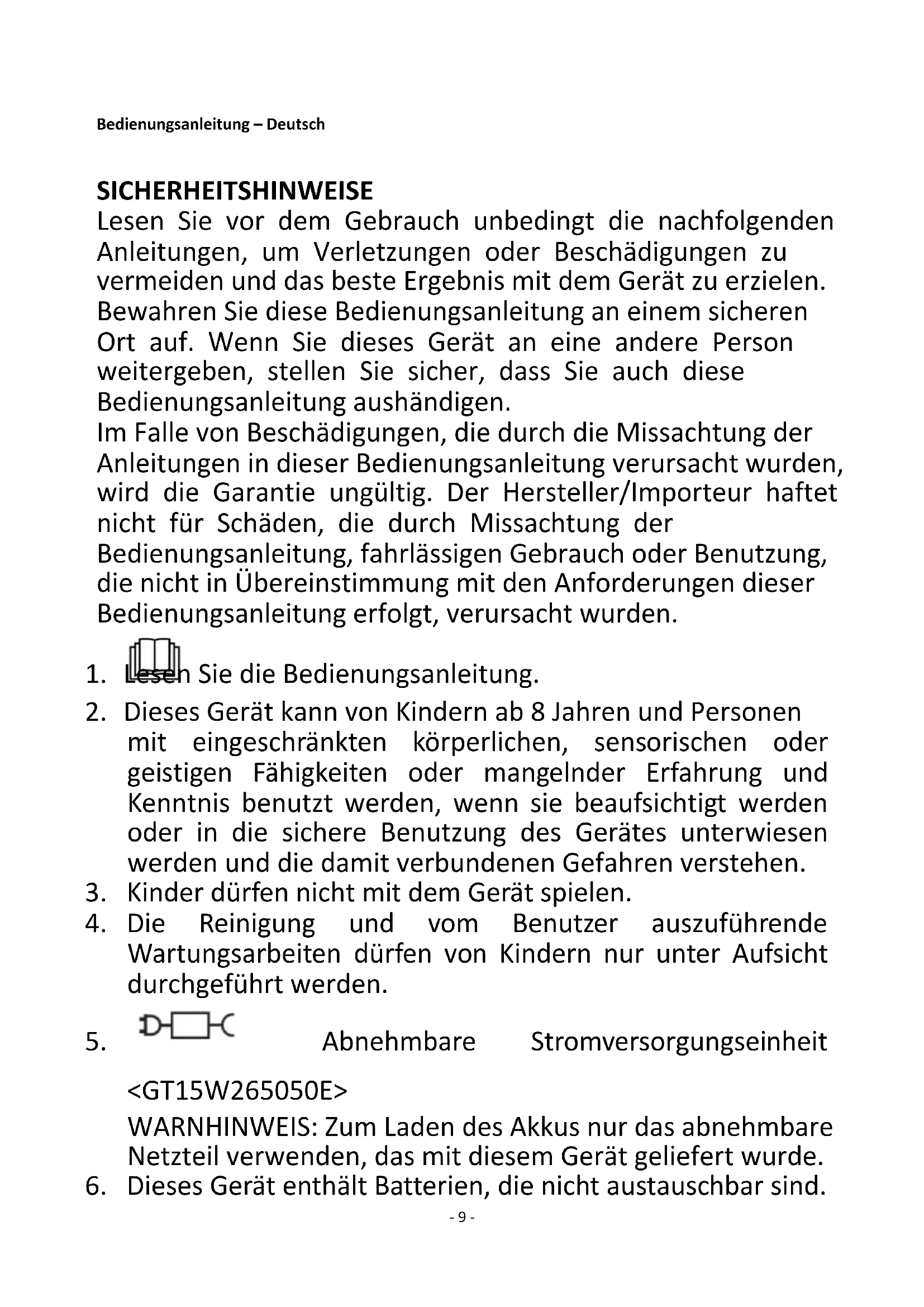 <GT15W265050E> WARNHINWEIS: Zum Laden des Akkus nur das abnehmbare Netzteil verwenden, das mit diesem Gerät geliefert wurde.